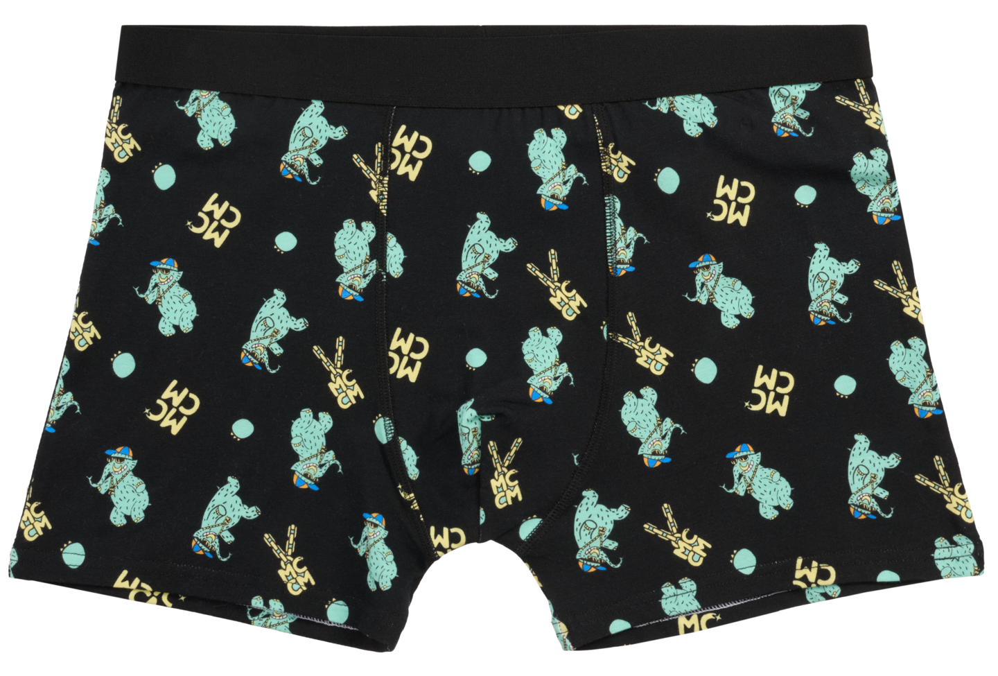 Miesten bokserit, joissa mammutti-kuosi mustalla pohjalla. Musta vyötärökuminauha. Materiaali joustavaa puuvilla-elastaania.