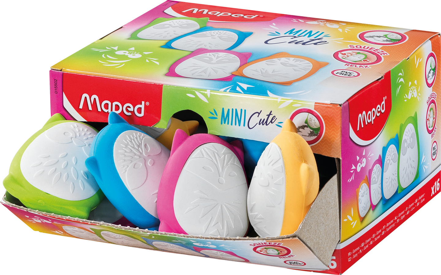Supersuloinen ja hauska, fidget-tyylinen Maped MiniCute Squeeze pyyhekumi.Pehmeä ja mukava hypisteltävä kädessä ja helppo käyttää. Purista pyyhekumia ennen pyyhkimistä. Ei sisällä PVC:tä tai ftalaatteja. Neljä eri väriä.