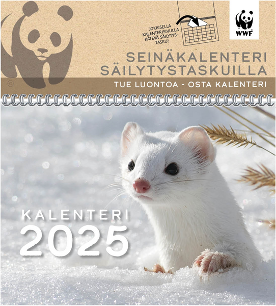 Taskullinen WWF seinäkalenteri. Kätevä säilytystasku joka aukeamalla. Suomalaiset nimipäivät, kalenteriosan laatinut Helsingin Yliopiston Almanakkatoimisto. Jokaisesta kalenterista lahjoitus WWF:n luonnonsuojeluun.