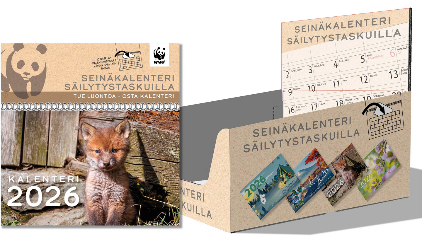 Taskullinen WWF seinäkalenteri. Kätevä säilytystasku joka aukeamalla. Suomalaiset nimipäivät, kalenteriosan laatinut Helsingin Yliopiston Almanakkatoimisto. Jokaisesta kalenterista lahjoitus WWF:n luonnonsuojeluun.