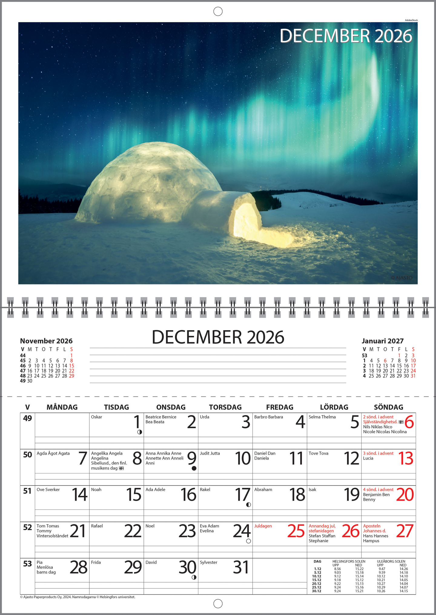 Håller reda på viktiga papper året runt. Format 250 x 176 mm, uppslagen 250 x 352 mm; wire-o-bunden; kalenderdelen bildar en kom-ihåg-ficka för räkningar och viktiga papper; plats för dagliga anteckningar; försedd med en extra ficka för kvitton, räkningar o.dyl.; Finlands karta i färg; namnsdagar och helgdagar; solens upp- och nedgångstider (Helsingfors, Uleåborg); FSC®-sertifierad produkt.
