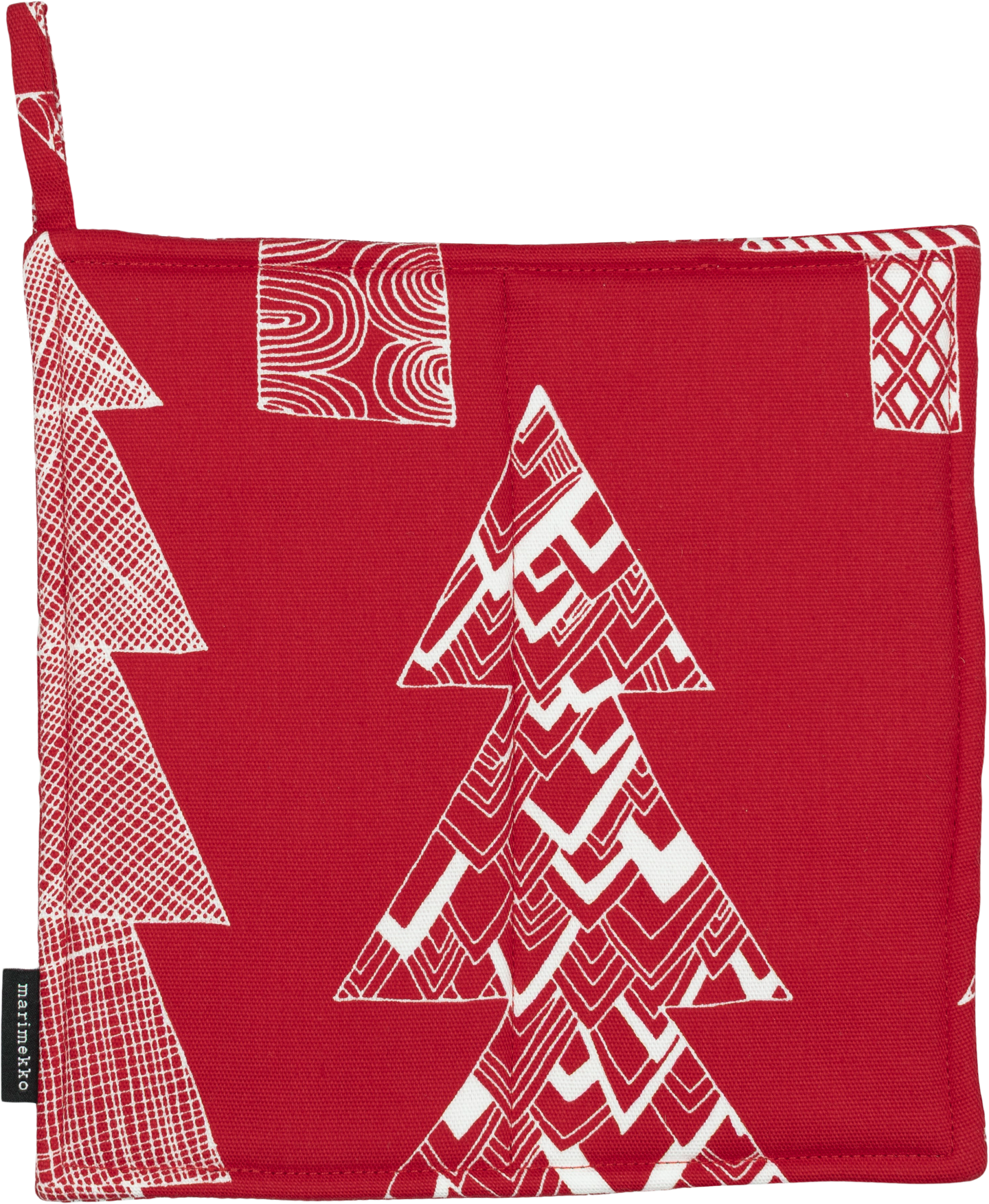 Puuvillasta valmistetussa pannulapussa on toppaus sekä lenkki ripustamista varten. Pannulappua koristaa Maija Louekarin suunnittelema Kuusikossa-kuosi.