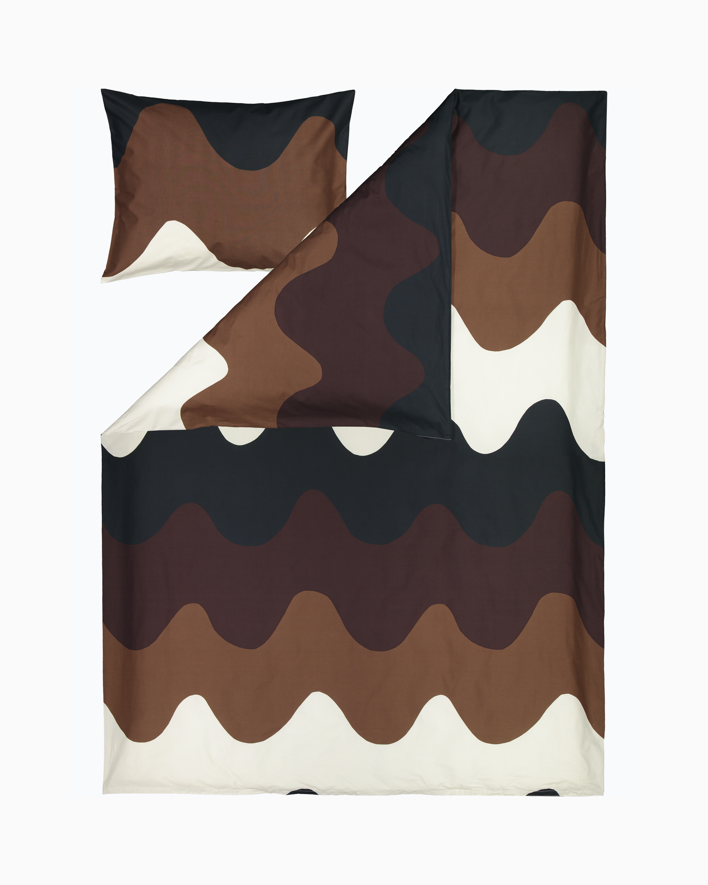 Puuvillasta valmistetussa Marimekon pussilakanasetissä on nelivärinen Lokki-kuosi, jonka ajatuksena on luoda tilaan aaltomainen ja runsas tunnelma. Design: Maija Isola, 1961. Setissä pussilakana 150 x 210 cm ja tyynyliina 50 x 60 cm. Väri: syksyisen ruskea. Nuku pehmeästi!