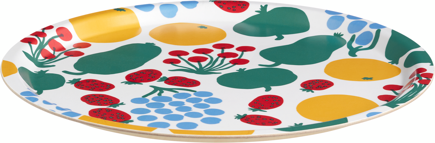 Laminoitua kevyttä koivuvaneritarjotinta koristaa monivärinen Tori-kuosi. Tarjotin on halkaisijaltaan 31 cm.