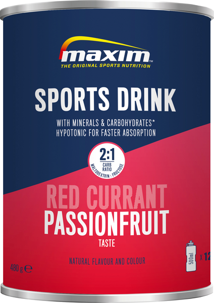 Maxim Sports Drink Red Currant & Passion Fruit on virkistävä urheilujuomajauhe, josta saat energiaa suorituksen aikana. Hiilihydraattisuhde: 2:1 maltodekstriiniä ja fruktoosia. Tuote sisältää myös mineraaleja: natriumia, kaliumia ja magnesiumia. Hiilihydraattielektrolyyttiliuos edistää kestävyyssuoritusta pitkäkestoisen kestävyysharjoittelun aikana ja parantaa veden imeytymistä fyysisen suorituksen aikana. Magnesium edistää elektrolyyttitasapainoa ja auttaa vähentämään väsymystä ja uupumusta. Hypotoninen urheilujuoma on helppo sekoittaa ja imeytyy elimistöön nopeammin. Houkutteleva punaherukan- ja passionhedelmänmaku. On tärkeää noudattaa tasapainoista ja monipuolista ruokavaliota sekä terveitä elämäntapoja.