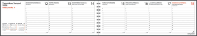 Ympäristöystävällinen vaihtoehto työpisteen vakiokalenteriksi. Koko 255 x 95 mm; parikierresidottu; kielisyys: suomi, ruotsi; päiväkirja 51/2025–1/2027; vuosisuunnitelma 2027; kansalliset vapaapäivät päiväkirjan sivuilla ja luettelona; muistiinpanosivuja; kierrätyskartonkikannet ja kierrätyspaperi.