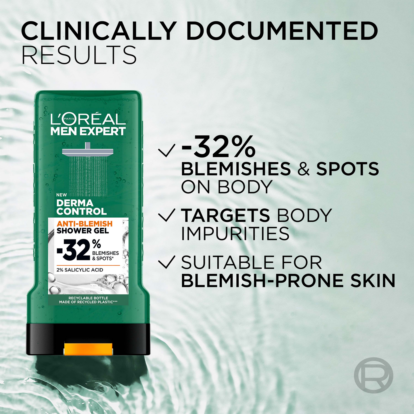L'Oréal Paris Men Expert Derma Control on tehokas suihkugeeli miehille. Koostumus vähentää näkyvästi epäpuhtauksia ja finnejä vartalolla samalla, kun tunnet olosi puhtaaksi ja raikkaaksi. Suihkugeelin koostumus sisältää 2 % salisyylihappoa, joka tunnetaan puhdistavista ominaisuuksistaan. Raikas tuoksu viipyy vartalolla pitkään. • 32 % vähemmän epäpuhtauksia ja finnejä* • Virkistävä tuoksu • Koostumus sisältää salisyylihappoa • Testattu ihotautilääkärin valvonnassa • Raikas tunne * Vartalolla, kosmeettis-kliininen testi, 52 miestä 1 kuukauden käytön jälkeen