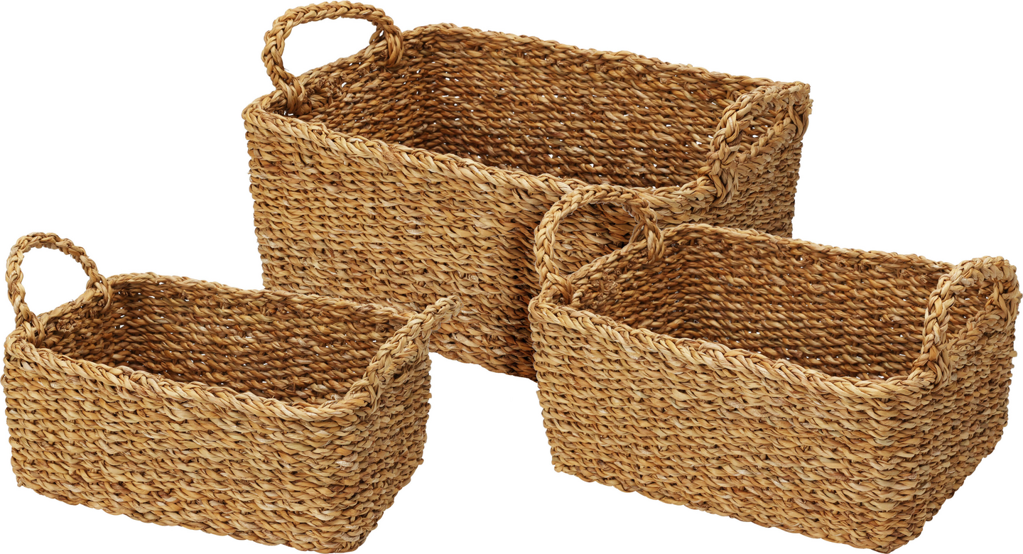 Luonnonmateriaalista valmistettu säilytyskori on käytännöllinen ja kaunis sisustuselementti. Korissa voi säilyttää lehtiä, leluja, asusteita ja pitää kaapin siistinä sekä järjestyksessä. Korin pituus on 36 cm, leveys 27 cm ja korkeus 24 cm. Korissa on siirtelyä helpottavat kantokahvat päissä. Kuvassa suurin kori.