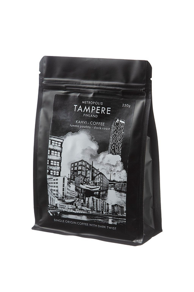Metropolis Tampere kahvin kahvi on peräisin Etiopiasta. Tummapaahtoinen kahvi omaa marjaisen aromin ja runsaan, monivivahteikkaan maun. Kahvin ulkoasu on tamperelaisen designer Jussi Lahtisen suunnittelema.