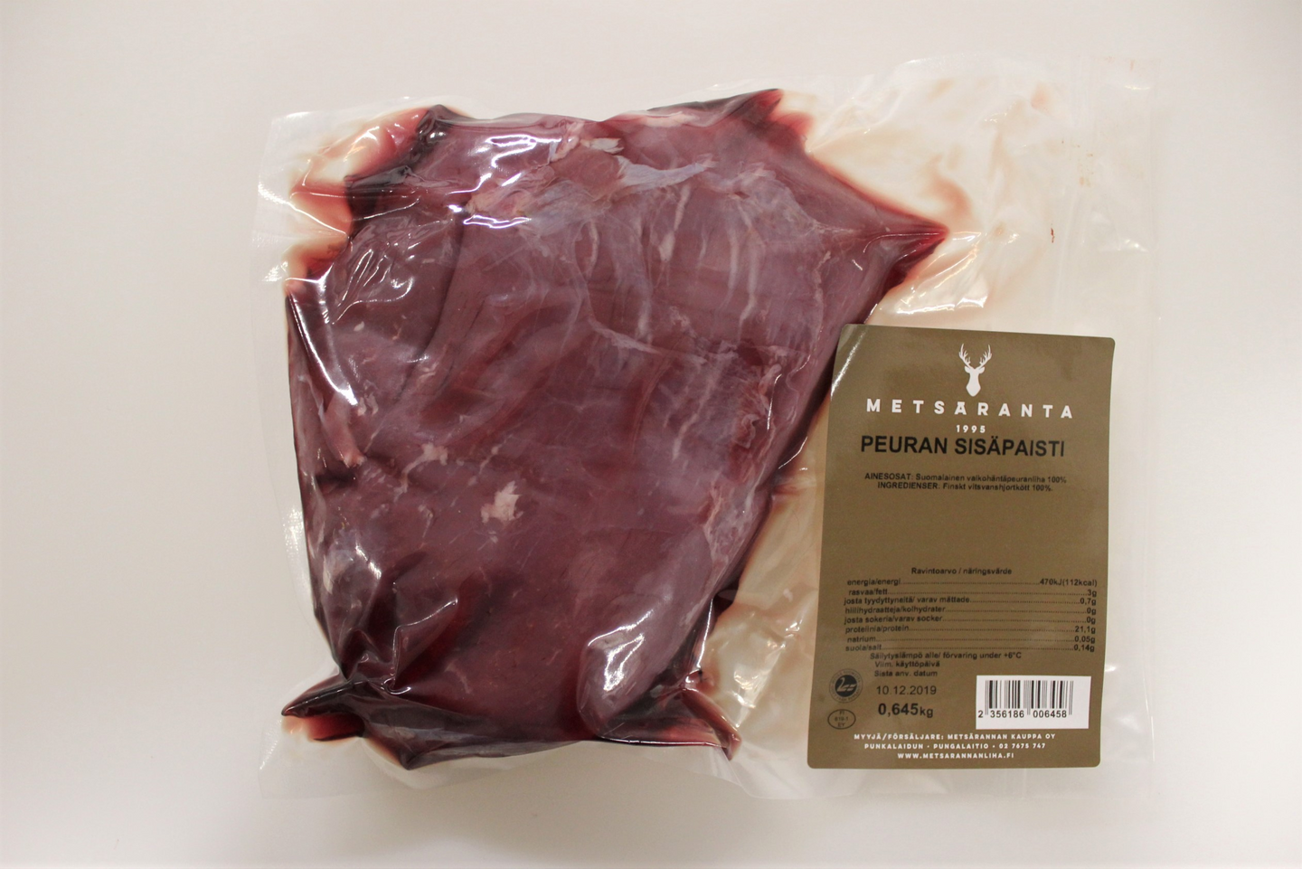 Peuran sisäpaisti, pakaste. Yksittäisen tuotteen keskimääräinen paino on 1 000 g.