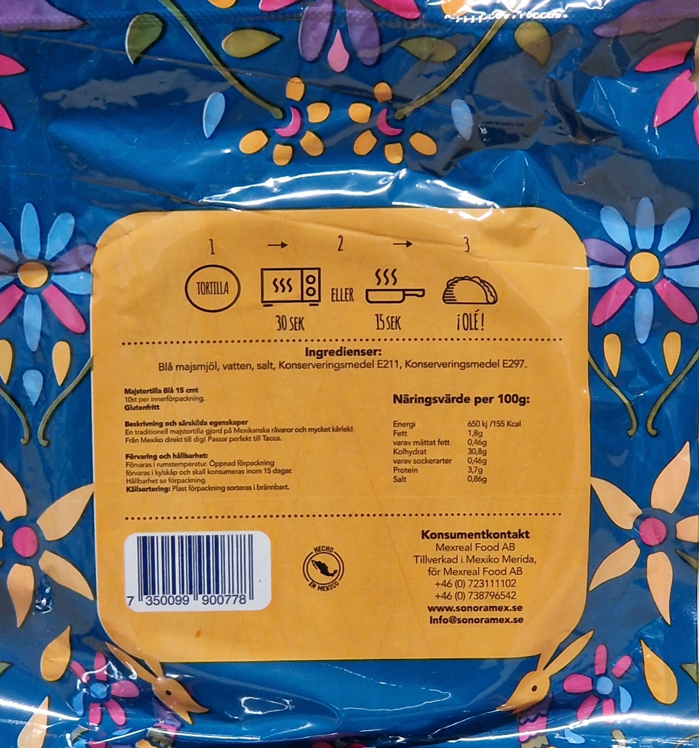 Mexreal Sininen Maissitortilla on perinteinen meksikolainen tortilla, joka on valmistettu täysin luonnollisesta sinisestä maissijauhosta. Sininen maissi antaa tortillalle sen luonnollisen värin sekä täyteläisen ja hieman pähkinäisen maun. Tämä gluteeniton tortilla on erinomainen vaihtoehto perinteisille vehnätortilloille ja sopii täydellisesti monenlaisiin täytteisiin. Siniset maissitortillat ovat suosittuja erityisesti tacojen, quesadillojen ja enchiladojen valmistuksessa. Ne sopivat hyvin myös grillattujen kasvisten, merenelävien ja perinteisten meksikolaisten liharuokien kanssa. Lämmitä pannulla tai uunissa ja täytä haluamillasi aineksilla. Autenttinen meksikolainen tortilla täyteläisellä maissin maulla – gluteeniton ja monipuolinen valinta ruoanlaittoon.