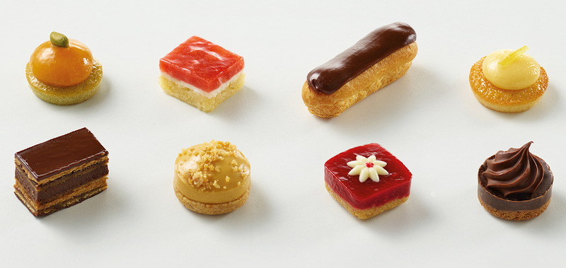 Minileivoslajitelma: 6 aprikoosi-pistaasileivosta - 6 mantelikeksi-mousseleivosta - 6 suklaaeclair-leivosta - 6 mantelikeksi-sitruunaleivosta - 6 Opera-leivosta - 6 karamellileivosta - 6 vadelmaleivosta - 6 suklaamuroleivosta