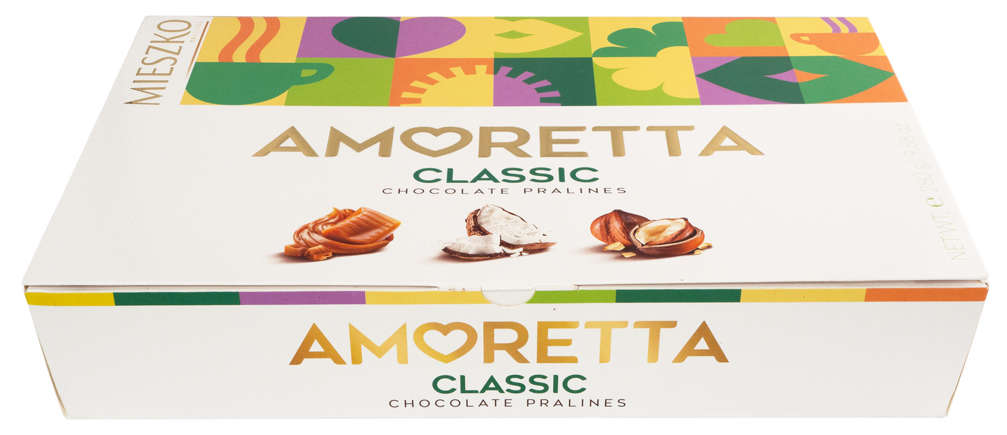 Herkullinen täytesuklaarasia, jossa makuina: toffee, pistaasipähkinä, hasselpähkinä, kookos, kerma ja manteli.