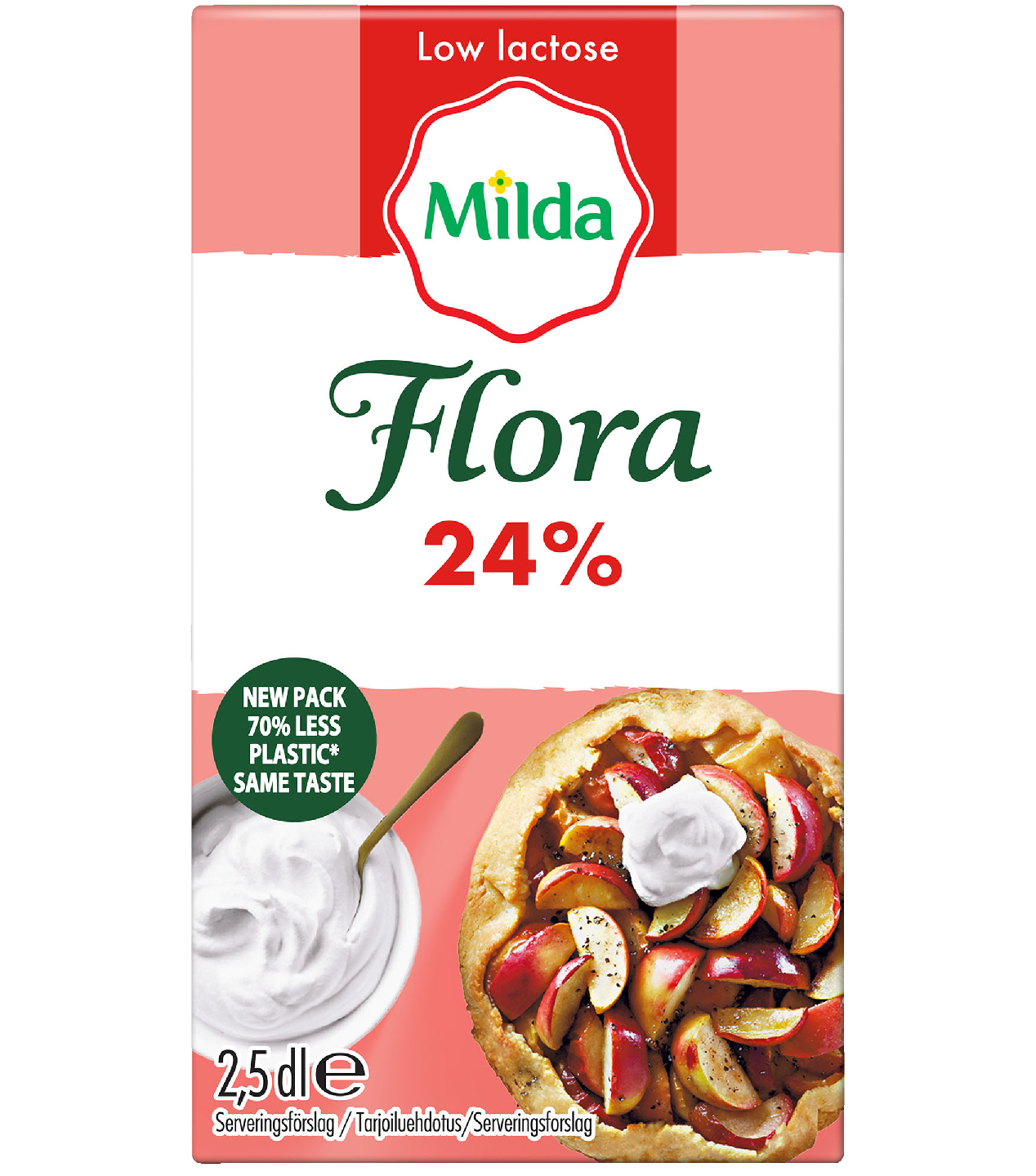 Flora by Milda Vispi 24 % vähälaktoosinen sopii erityisen hyvin leivontaan kuten kakkujen täytteisiin ja pursotuksiin, mutta sitä voi hyvin käyttää myös lämpimien ruokien valmistuksessa. Flora by Milda Vispi on vispautuva maitopohjainen kasviöljysekoite, jonka kermainen koostumus sopii mainiosti kakkujen, piirakoiden, hedelmien, marjojen tai muiden jälkiruokien lisukkeeksi. Flora by Milda Vispi on tavallista vispikermaa kevyempi ja se antaa runsaan vaahdon sekä täyteläisen koostumuksen jälkiruokiin ja kakkuihin. Flora by Milda Vispi vispautuu parhaiten jääkaappikylmänä ja sen vaahto kestää pakastamisen.