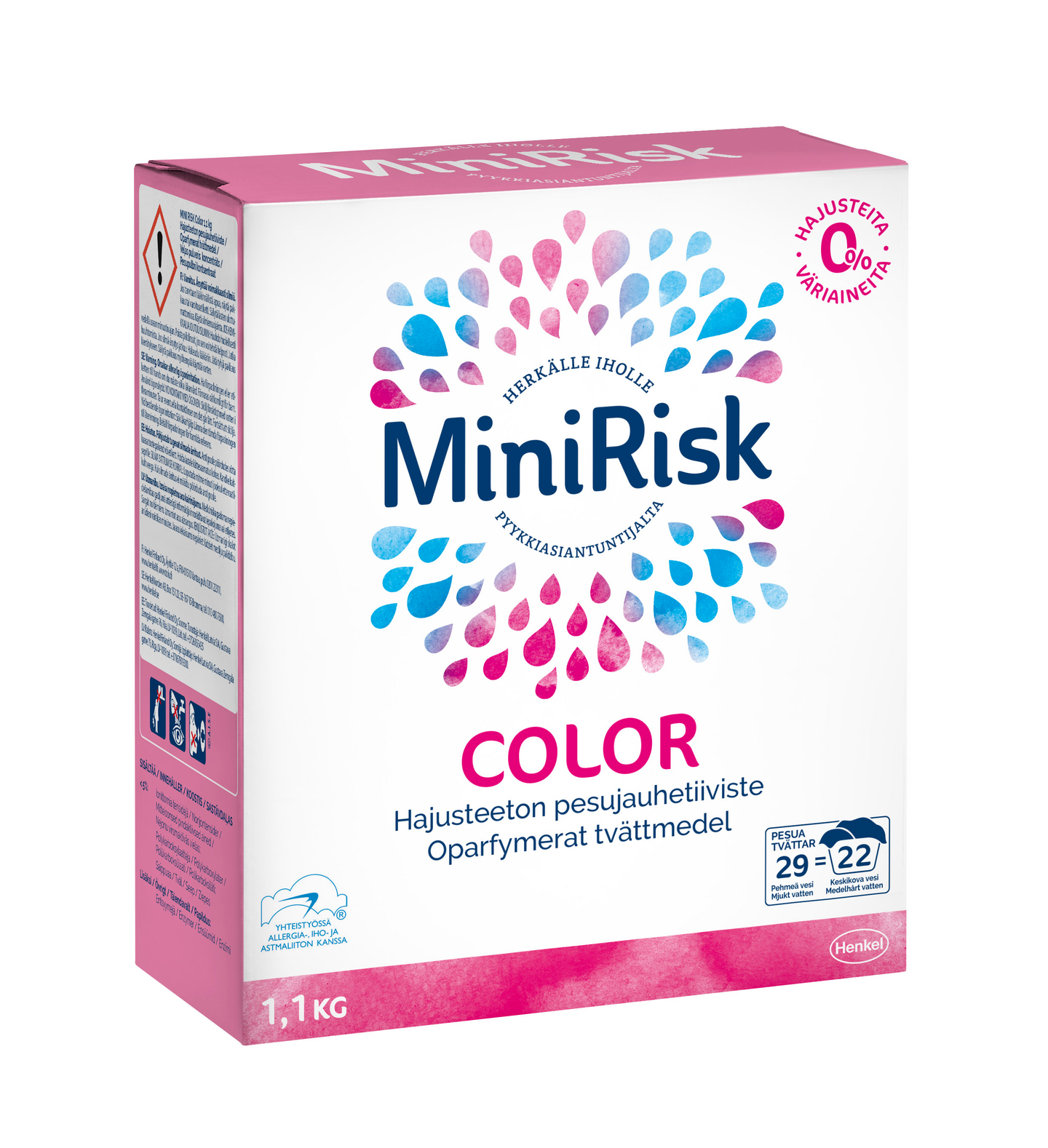 Hajusteeton pesujauhetiiviste kirjo- ja yleispyykille. Ei sisällä säilöntä- tai väriaineita. Kehitetty yhteistyössä Allergia-, iho- & astmaliiton kanssa. Mini Riskin pesuaktiiviset aineet ovat biologisesti hajoavia.