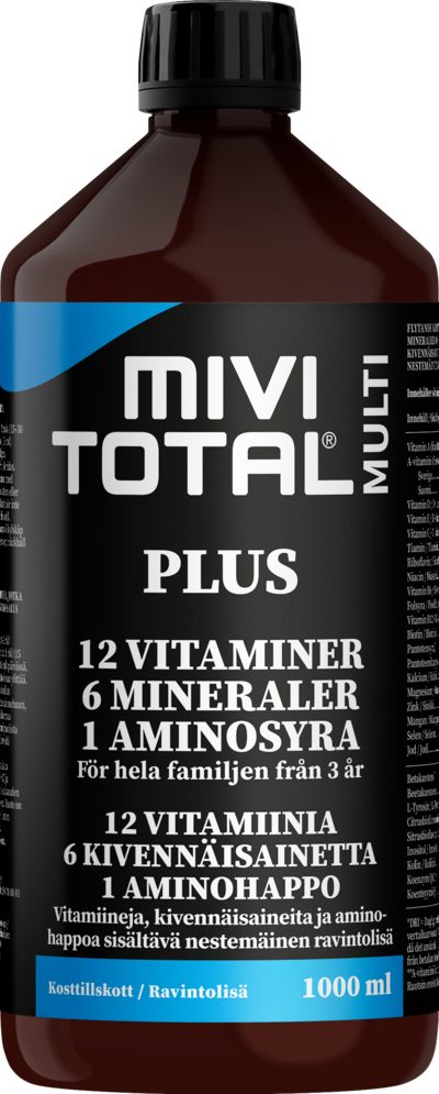 Mivitotal® Plus on nestemäinen vitamiini- ja kivennäisainevalmiste koko perheelle 3-vuotiaasta lähtien. Mivitotal® Plus sisältää muu n muassa C-vitamiinia, E-vitamiinia, riboflaviinia ja seleeniä, jotka auttavat suojaamaan soluja hapettumisstressiltä. Lisäksi C-vit amiini auttaa vähentämään väsymystä ja uupumusta. Ravintolisä ei korvaa monipuolista ja tasapainoista ruokavaliota eikä terveitä el ämäntapoja.