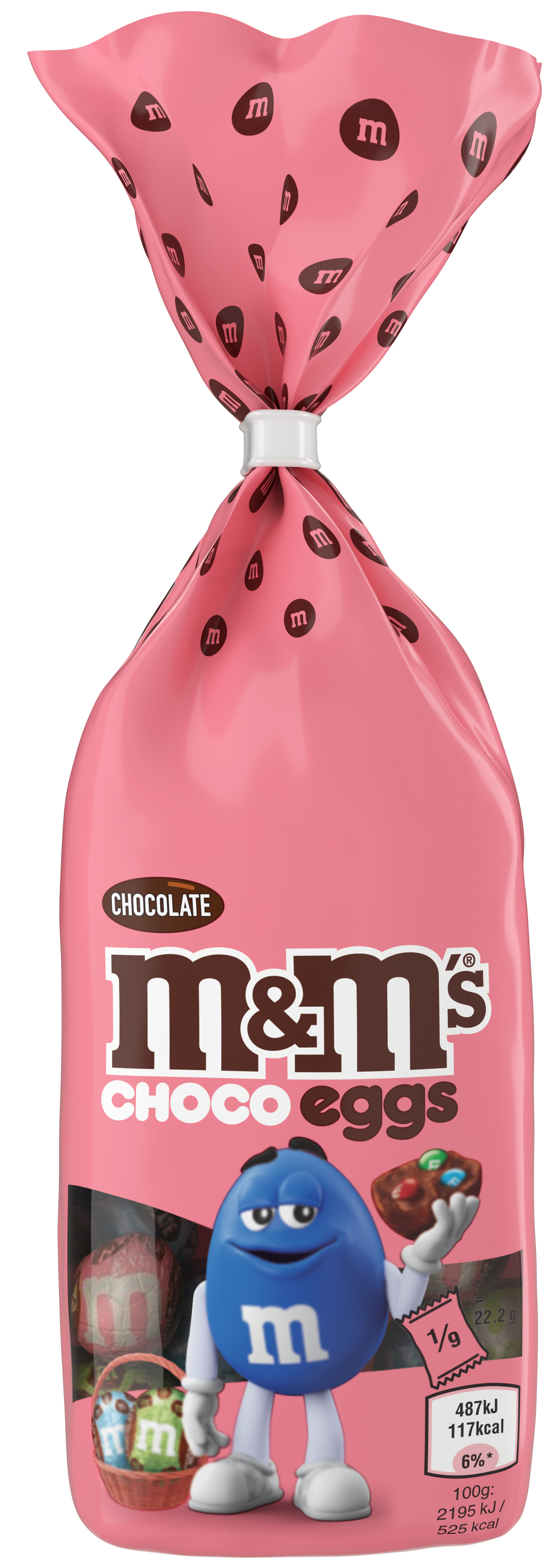 Maitosuklaamunia (71%) ja M&M’S minis -makeisia (26%) (maitosuklaa värikkäässä sokerikuoressa)