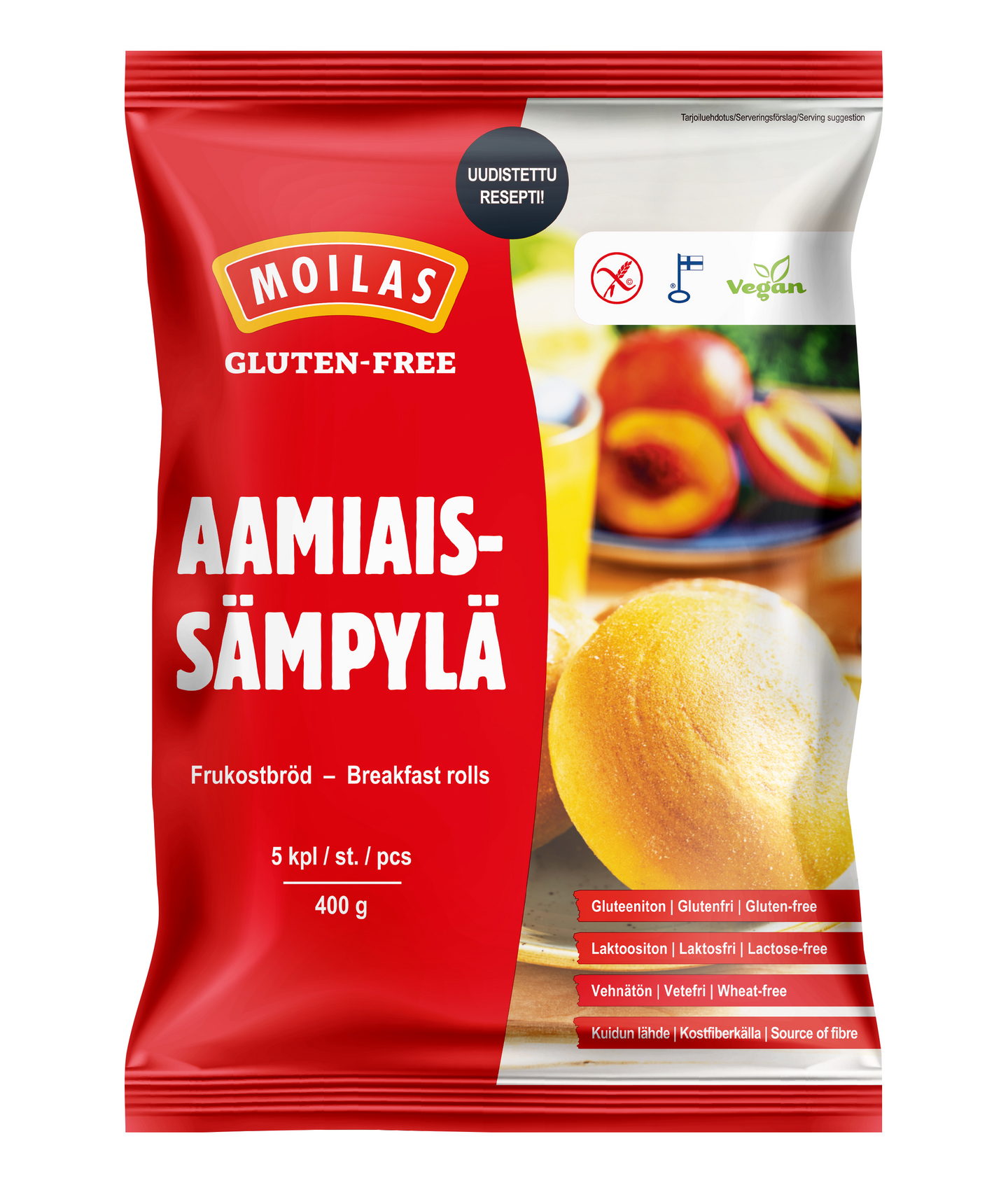 Vaalea, pyöreä, gluteeniton sämpylä, joka saa mehevyyttä ja kaunista väriä porkkanasoseesta. Pehmeä Aamiaissämpylä on myös kuidunlähde.