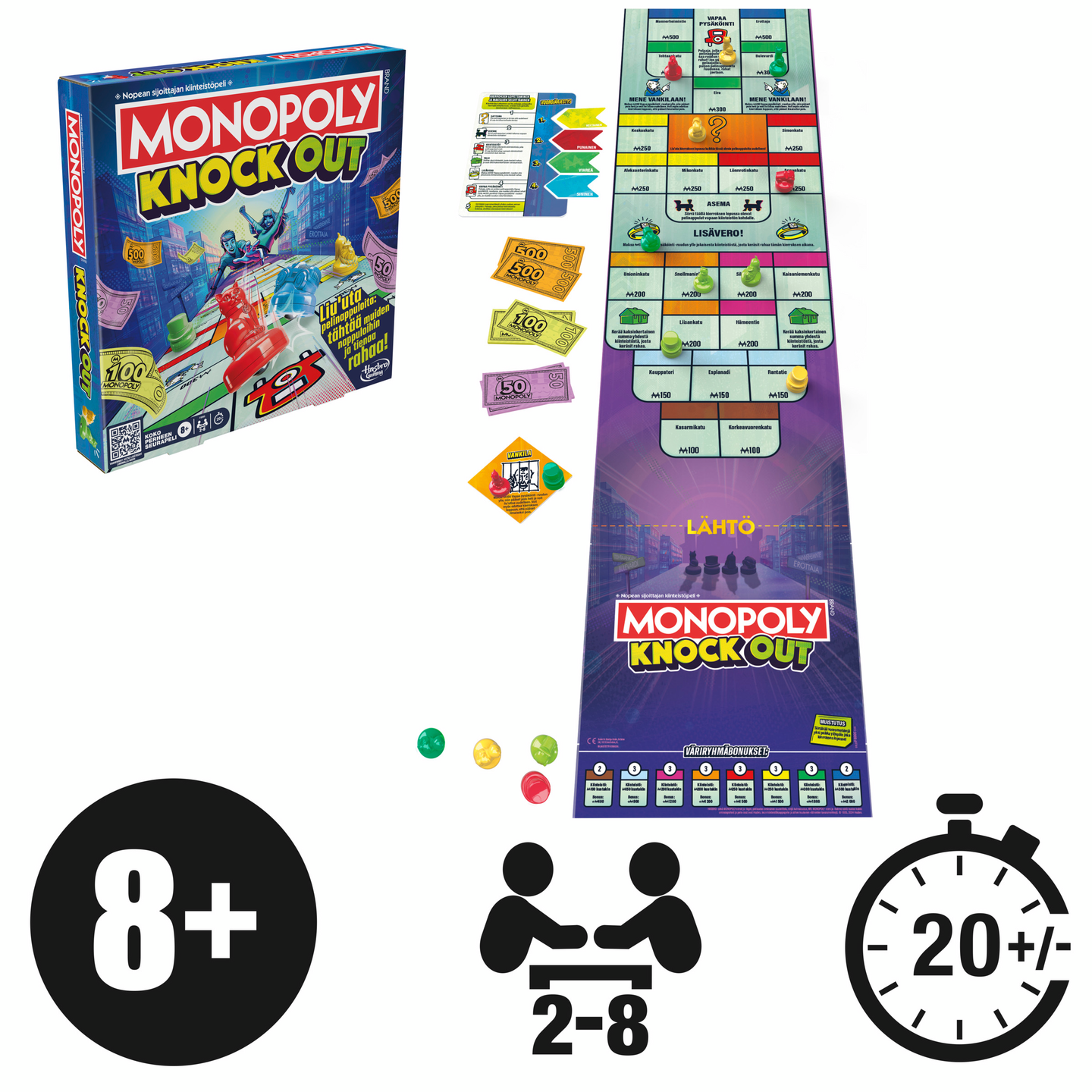 Monopoly Knockout -peli on perheen juhlapeli, jossa liikutellaan pelimerkkejä ja nautitaan rahankeruusta! Tässä aktiivisessa versiossa Monopoly-pelistä kilpaillaan pelimerkkien näytössä! Pelaajat pelaavat kierroksia, vuorotellen liikuttelemalla pelimerkkejään pitkin pitkää pelilautaa (yli 3 jalkaa!) ja yrittävät saada ne asettumaan kiinteistöille. Jokaisen kierroksen lopussa he keräävät tai maksavat käteistä sen perusteella, missä heidän pelimerkkinsä päättyivät. Joten tähtää tarkasti ja liu'uta, aseta pelimerkit parhaille kiinteistöille ja työnnä toisten pelaajien pelimerkit vankilaan tai kokonaan pois lautalta. Pelaaja, jolla on eniten käteistä pelin lopussa, voittaa! Etsitkö perheen juhlapeliä lapsille ja aikuisille tai hauskoja pelejä peli-iltaan? Tämä kevyt strategiapeli on loistava peli perhetapaamisiin, lomille ja muuhun. Hasbro Gaming, Parker Brothers ja Monopoly -nimet ja logot, pelilaudan erottuva muotoilu, neljä kulmaa, Mr. Monopoly -nimi ja hahmo sekä jokainen pelilaudan ja pelin osien erottuva elementti ovat Hasbron tavaramerkkejä sen kiinteistökauppapeliä ja pelivarustusta varten.