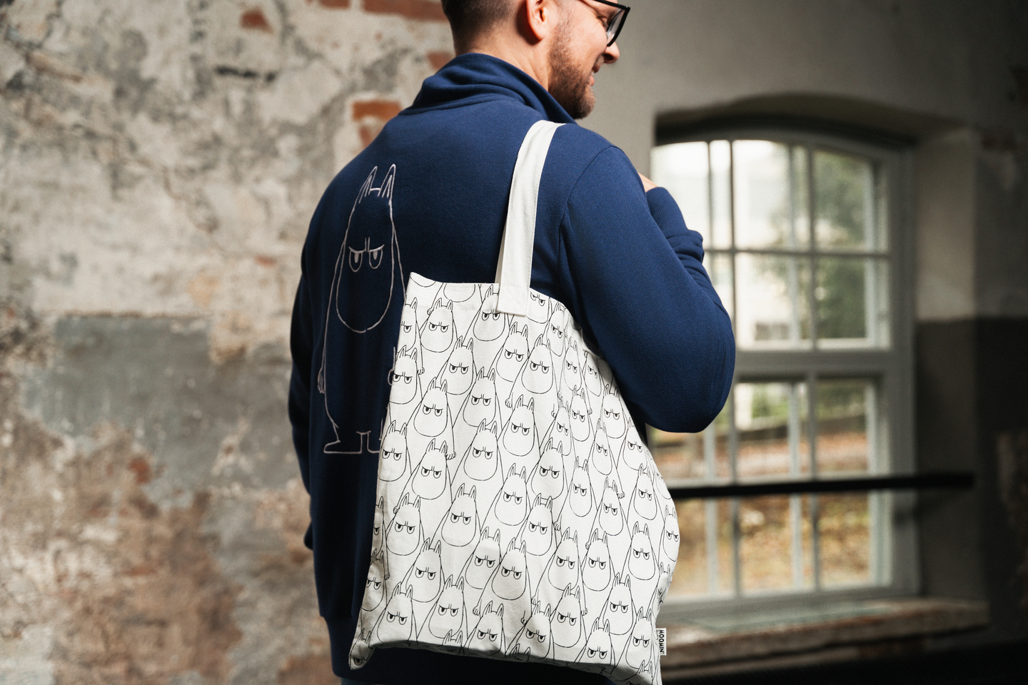 Kierrätetystä puuvillasta valmistettu kangaskassi, jossa on tukevat kantokahvat. Kassin toisella puolella on hauska muumiaiheinen printti.