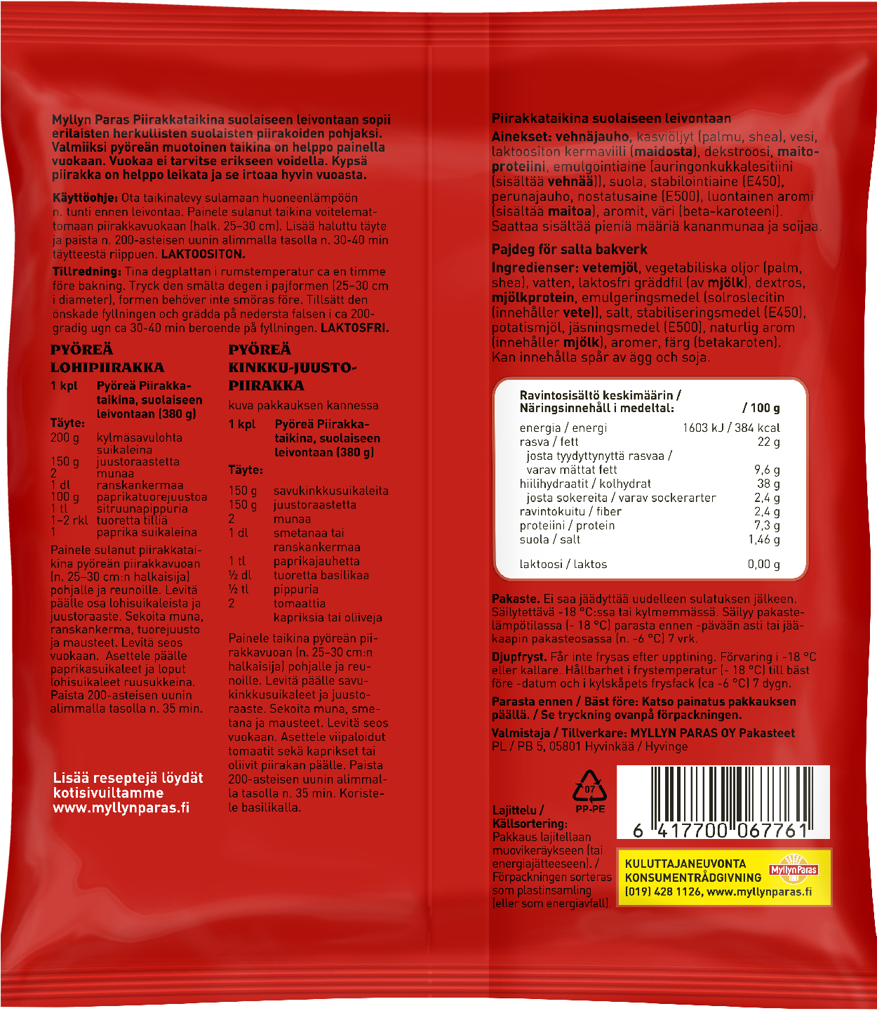 Myllyn Paras Pyöreä Piirakkataikina suolaiseen leivontaan sopii erilaisten herkullisten suolaisten piirakoiden pohjaksi. Valmiiksi pyöreän muotoinen taikina on helppo painella vuokaan. Vuokaa ei tarvitse erikseen voidella.