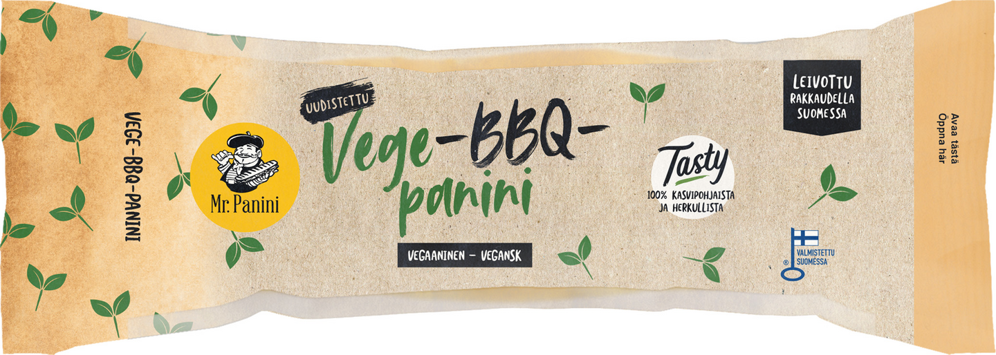 Vege-BBQ-panini sai täytteekseen Tasty-kasviproteiinin, joka on saanut kiitosta erityisesti herkullisesta maustaan. Tastyn proteiini tulee herneistä ja maistuu herkulliselta. Mukana on Mr. Panini oma vegaaninen BBQ kastike, jossa paljon makua. Vegaaninen herkku, joka maistuu kaikille.