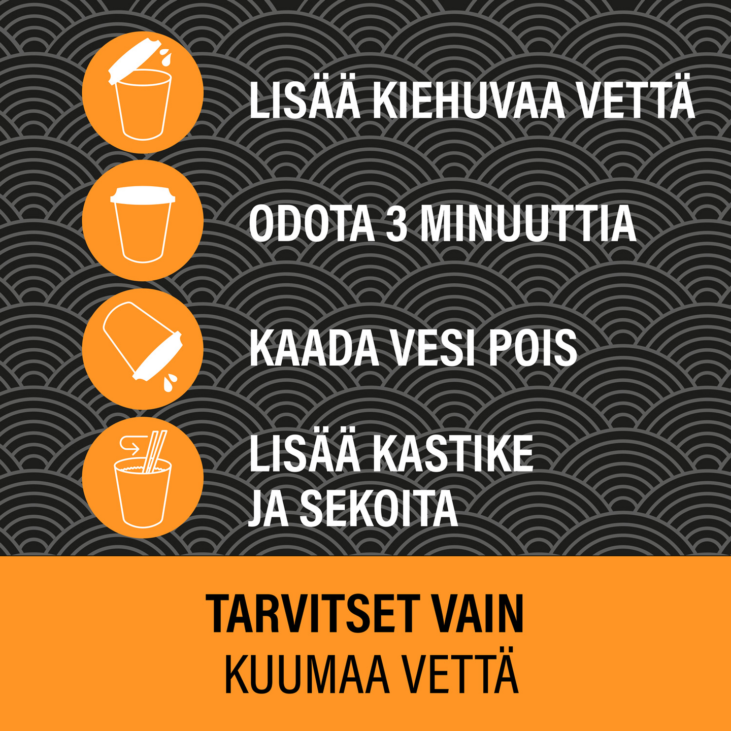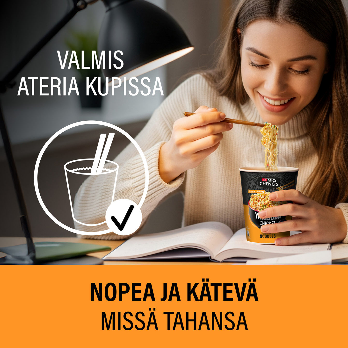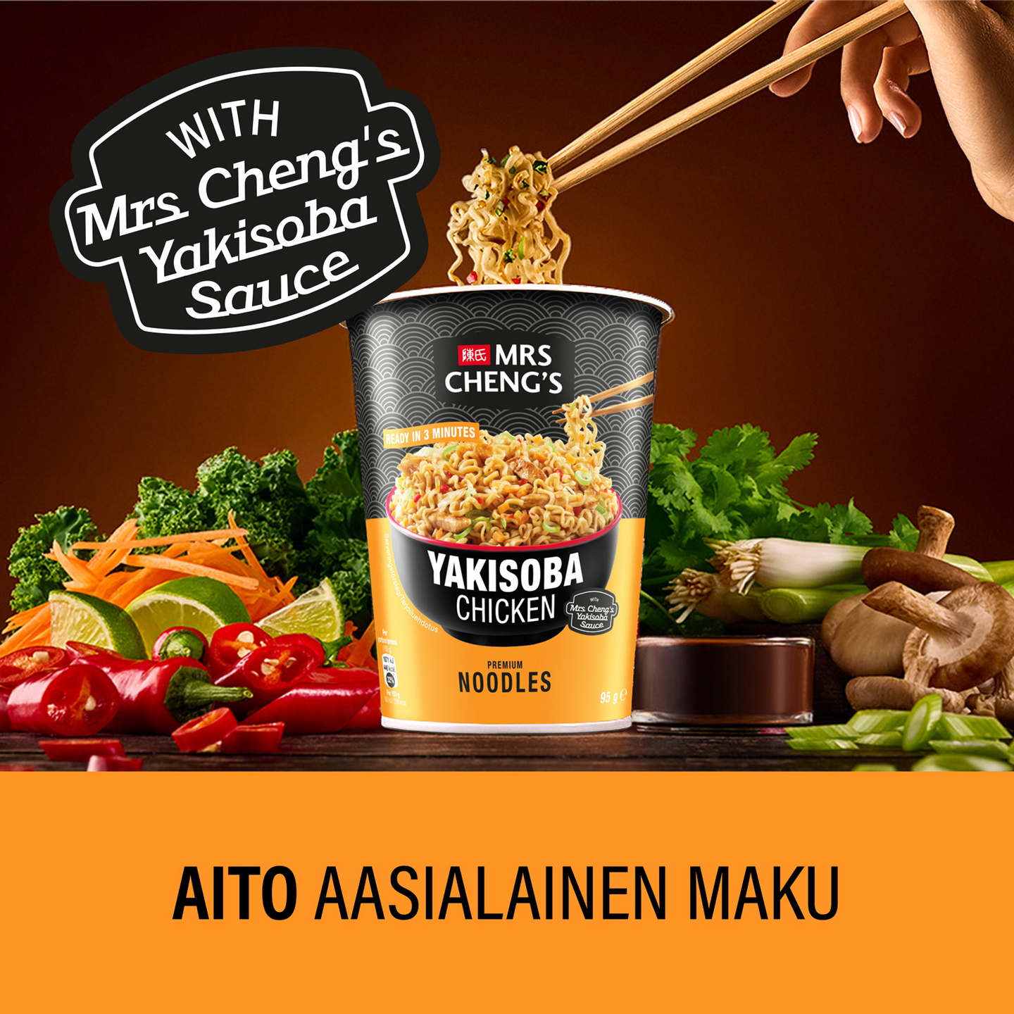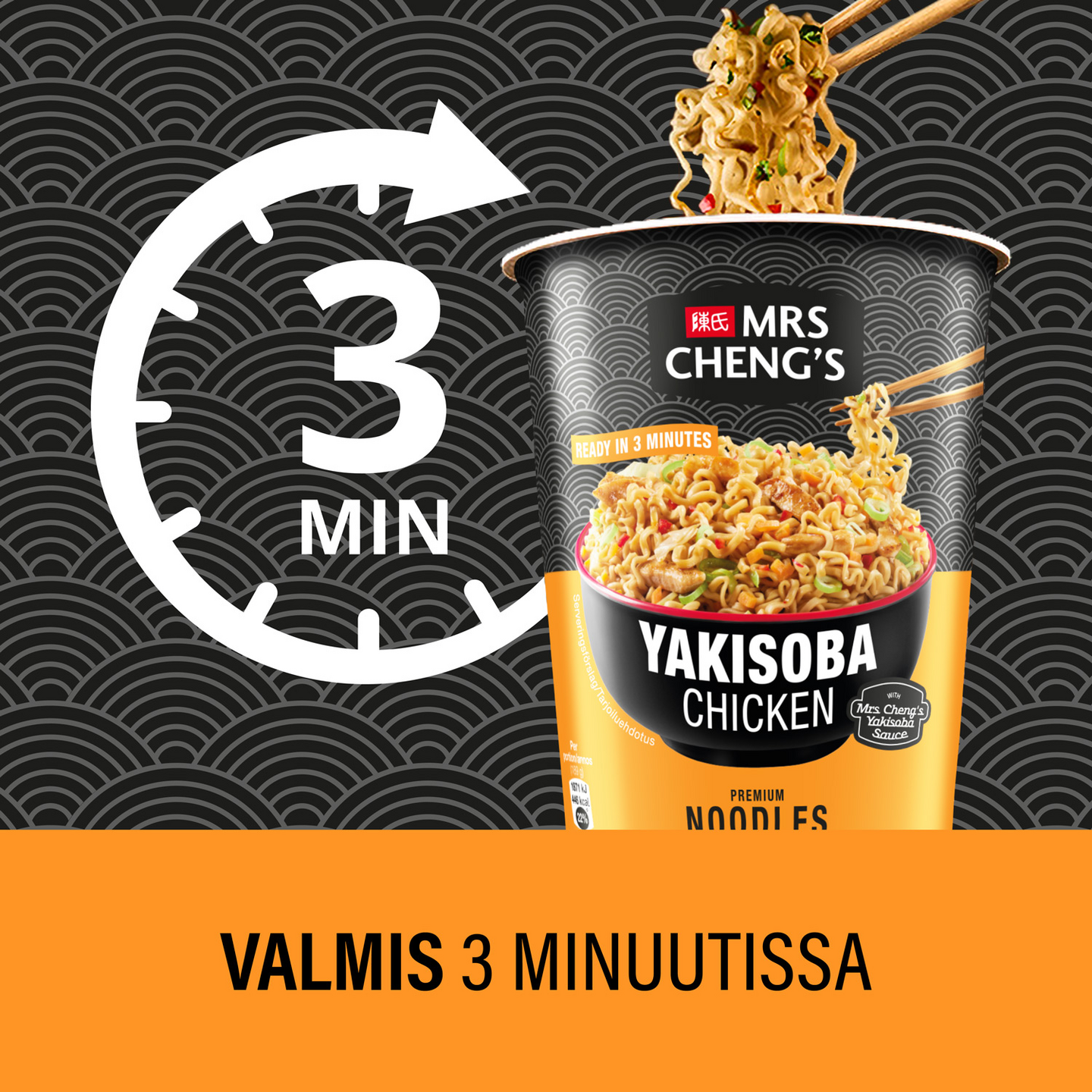 "Mrs Cheng's Yakisoba kananmakuinen kuppinuudeli yhdistää ensiluokkaisen laadun ja aidot aasialaiset maut. Maukas ateria on helppo ja nopea valmistaa 3 minuutissa. Kaada kiehuvaa vettä kuppiin nuudelien, kanan ja vihannesten päälle, minkä jälkeen odota kolme minuuttia. Kaada vesi pois kupista ja lisää Mrs Cheng's kastike nuudelien päälle koko ajan sekoittaen. Kun vesi on kaadettu pois, sekoittuu nestemäinen Yakisoba-kastike tasaisesti antaen nuudeleille täyteläisen maun. Valmis ateriakokonaisuus on helppo syödä siististi ilman roiskeita. Kätevän kupin ansiosta Mrs Cheng’s pikanuudelit sopivat täydellisesti mukaan otettavaksi välipalaksi kouluun, työpaikalle ja harrastuksiin tai nopeaksi ateriaksi kiireisen päivän päätteeksi. Mrs Cheng's nuudelit sopivat erinomaisesti myös ruuanlaittoon keittojen, wokkiruokien ja salaattien kanssa. Valitse suosikkimakusi laadukkaista Mrs Cheng's nuudeleista: kana, kasvis ja nauta, jotka on valmistettu Euroopassa. Katso lisää inspiraatiota sekä aasialaisia reseptejä verkkosivuiltamme mrschengs.fi"