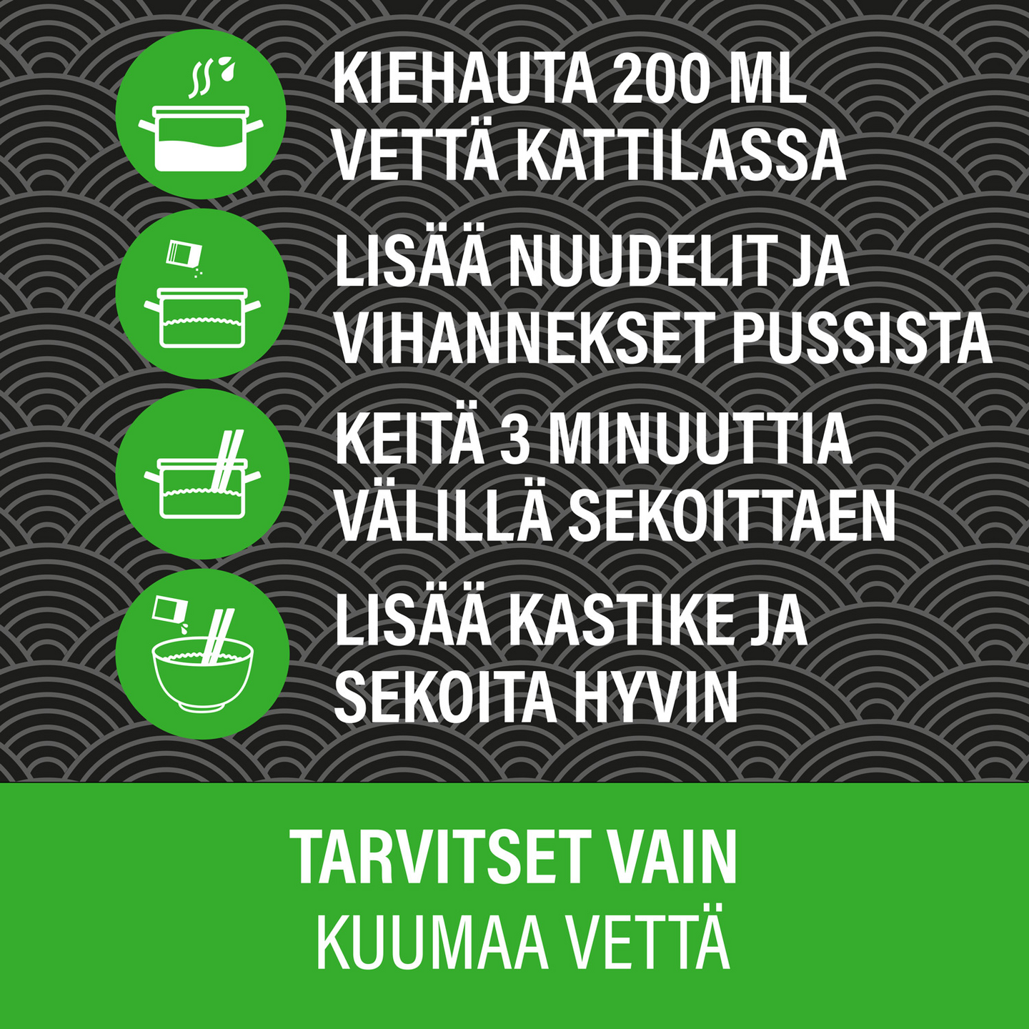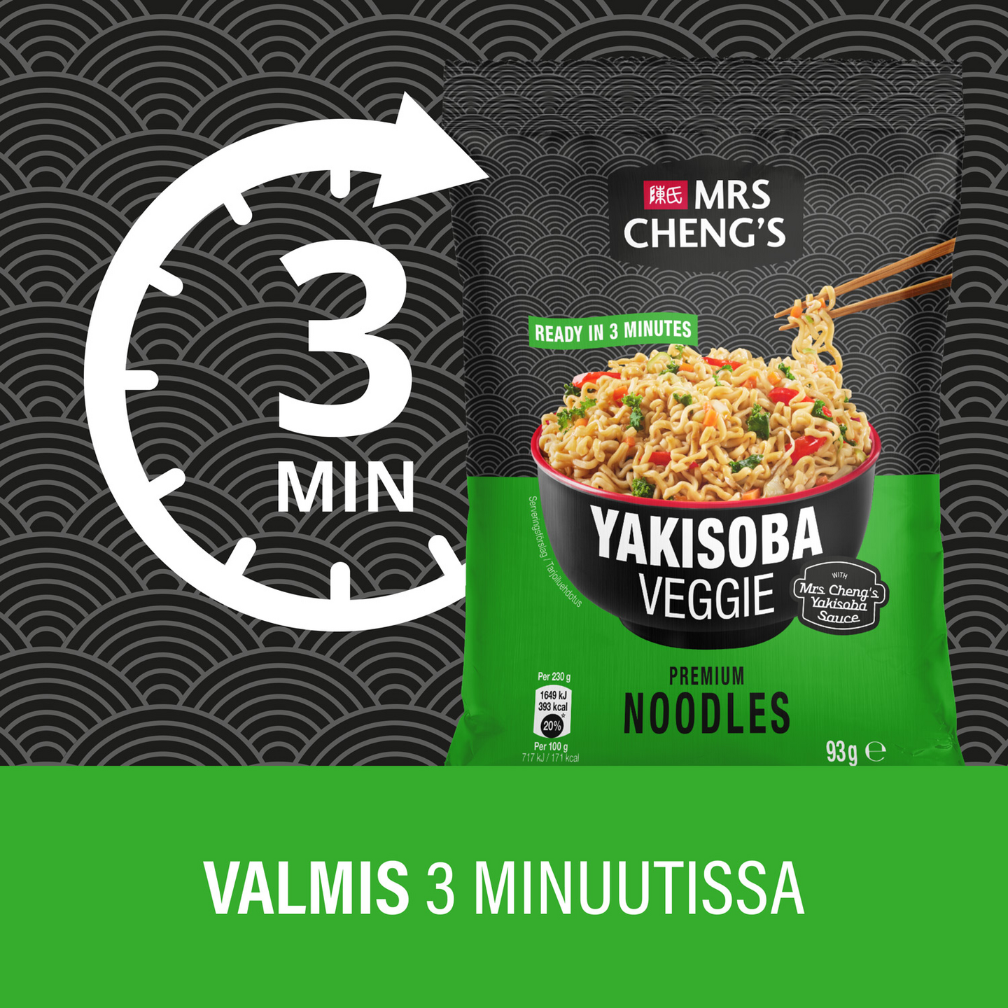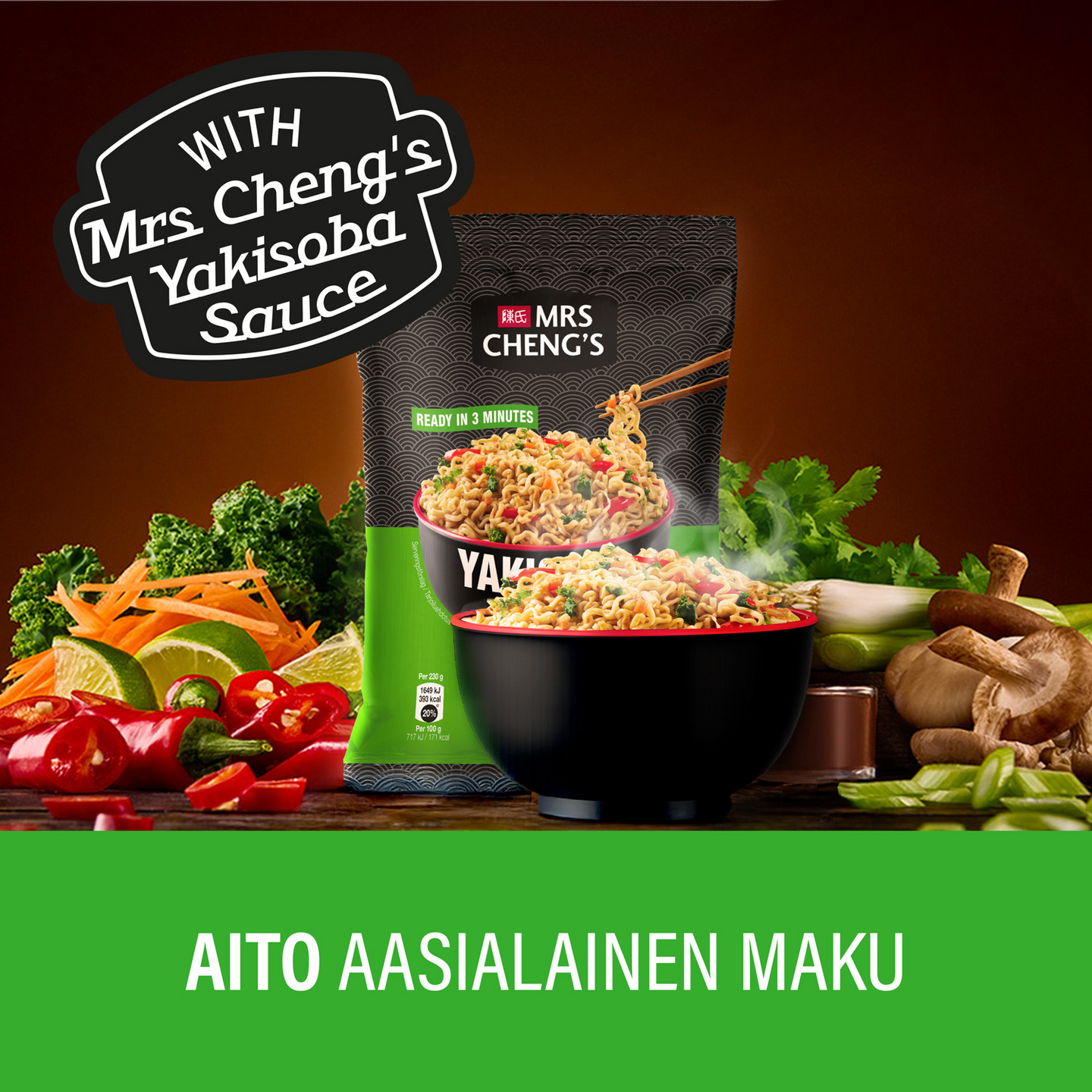 "Mrs Cheng's Yakisoba kasvispikanuudeli yhdistää ensiluokkaisen laadun ja aidot aasialaiset maut. Maukas ateria on helppo ja nopea valmistaa 3 minuutissa. Kaada kiehuvaa vettä pussista otettujen nuudelien ja vihannesten päälle, minkä jälkeen odota kolme minuuttia. Valuta vesi pois ja lisää Mrs Cheng's kastike nuudelien päälle koko ajan sekoittaen. Kun vesi on kaadettu pois, sekoittuu nestemäinen Yakisoba-kastike tasaisesti antaen nuudeleille täyteläisen maun. Valmis ateriakokonaisuus on helppo syödä siististi ilman roiskeita. Mrs Cheng’s pikanuudelit sopivat täydellisesti nopeaksi ateriaksi kiireisen päivän päätteeksi sekä ruuanlaittoon keittojen, wokkiruokien ja salaattien kanssa. Valitse suosikkimakusi laadukkaista Mrs Cheng's pikanuudelipusseista: kana ja kasvis, jotka on valmistettu Euroopassa. Katso lisää inspiraatiota sekä aasialaisia reseptejä verkkosivuiltamme mrschengs.fi"