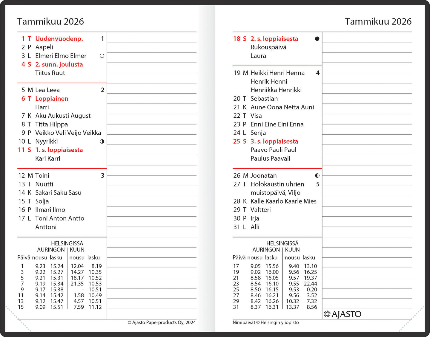 Taloudenpidon pikkuapulainen; pidä kirjaa tuloistasi ja menoistasi. Koko 82 x 128 mm; leatherette-kannet; sidottu; kaksi kalenteriosaa: kuukausi- ja vaakaviikkoaukeamat; päiväkirja 51/2025–53/2026; suomalaiset nimipäivät; maksupäiväkirja ja kassakirja; liputuspäivät Suomessa; vuosiruudukko; FSC®-sertifioitu tuote.