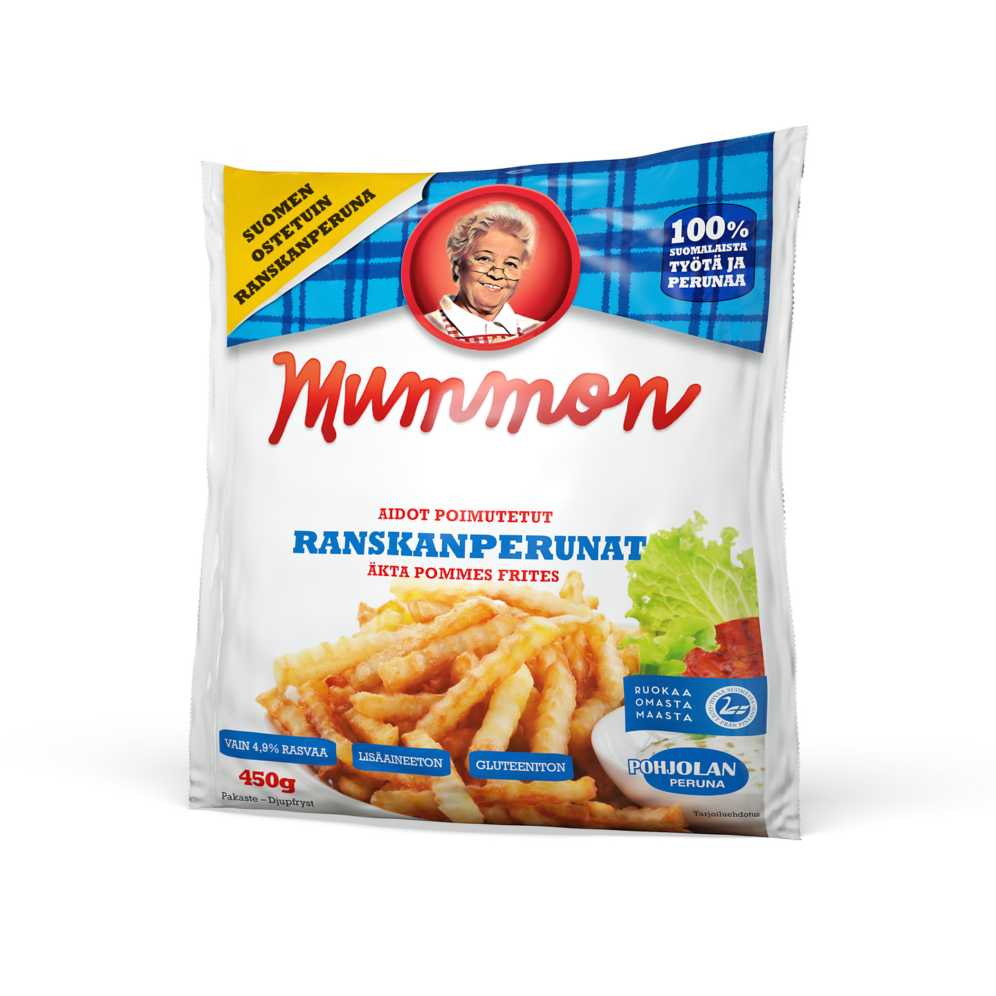 Tutut Mummon poimutetut ranskanperunat löydät nyt uusissa sydämellisissä pakkauksissa. Mummon ranskanperunoihin käytetään vain valikoituja perunalajikkeita, joilla saadaan tuotteeseen juuri oikea maku ja rapeus. Kaikki Mummon tuotteet valmistetaan 100% suomalaisesta perunasta.