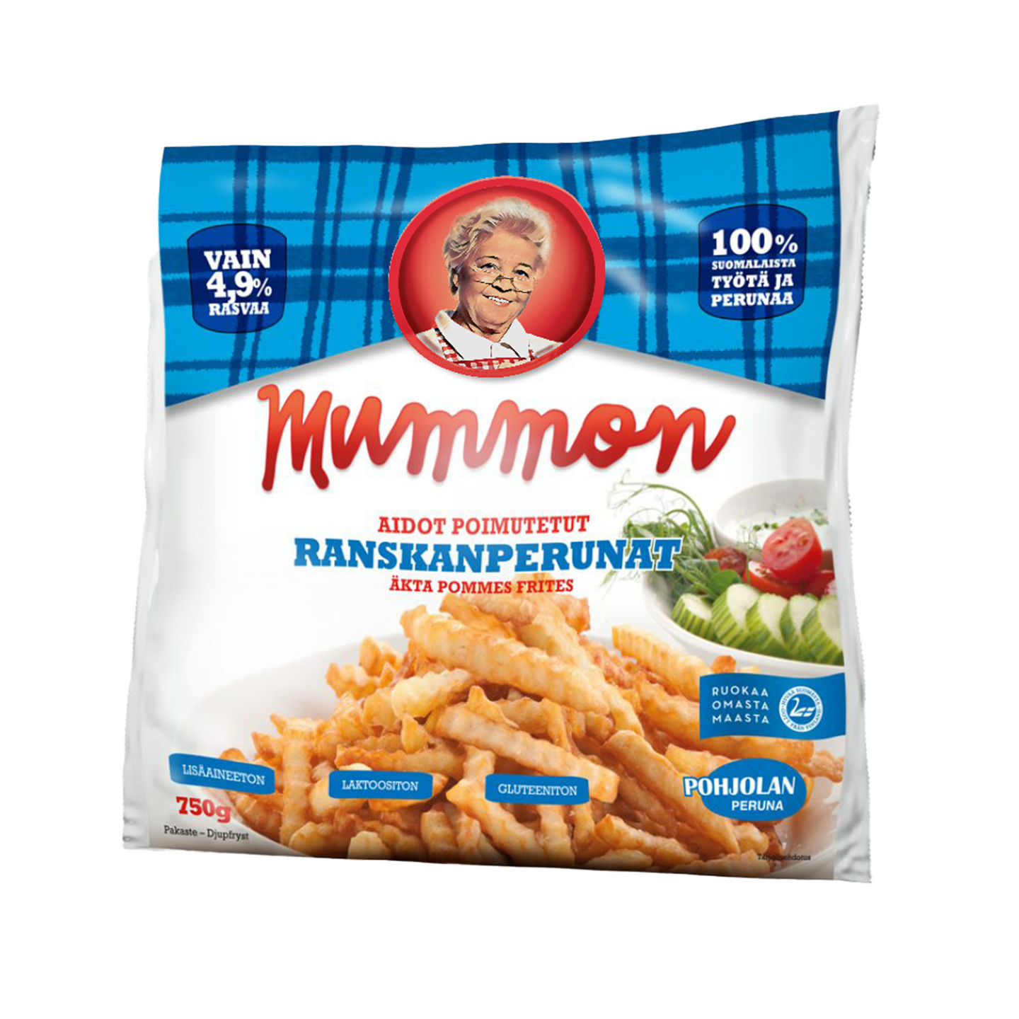 Mummon aidot poimutetut ranskanperunat ovat nopeasti ja helposti valmistuva lisuke niin lihapullille ja nakeille kuin myös kalapuikoille ja broilerinugeteille. Valmistettu suomalaisesta perunasta. Pakastetuote. Ei sisällä lisä- tai säilöntäaineita.