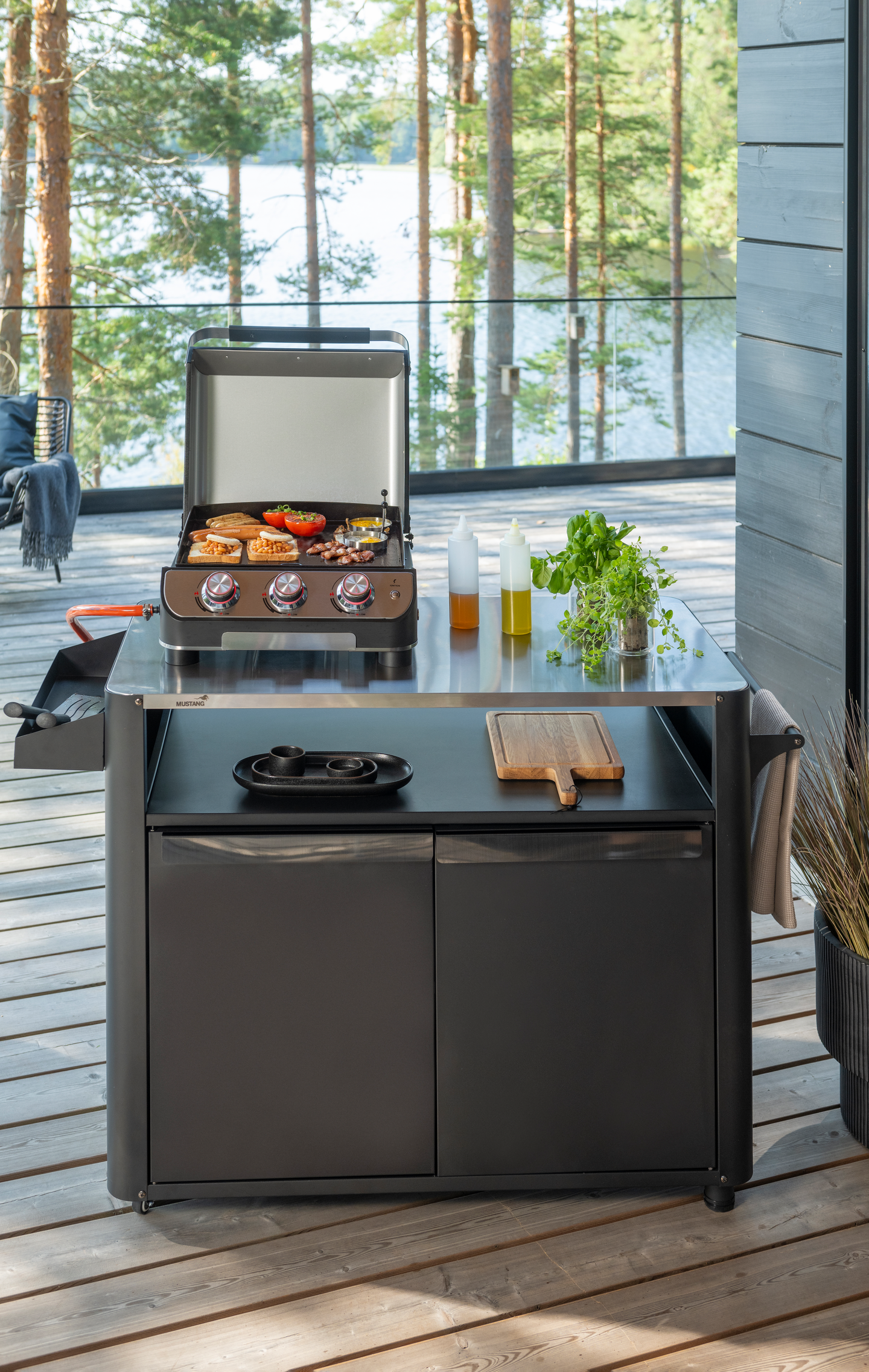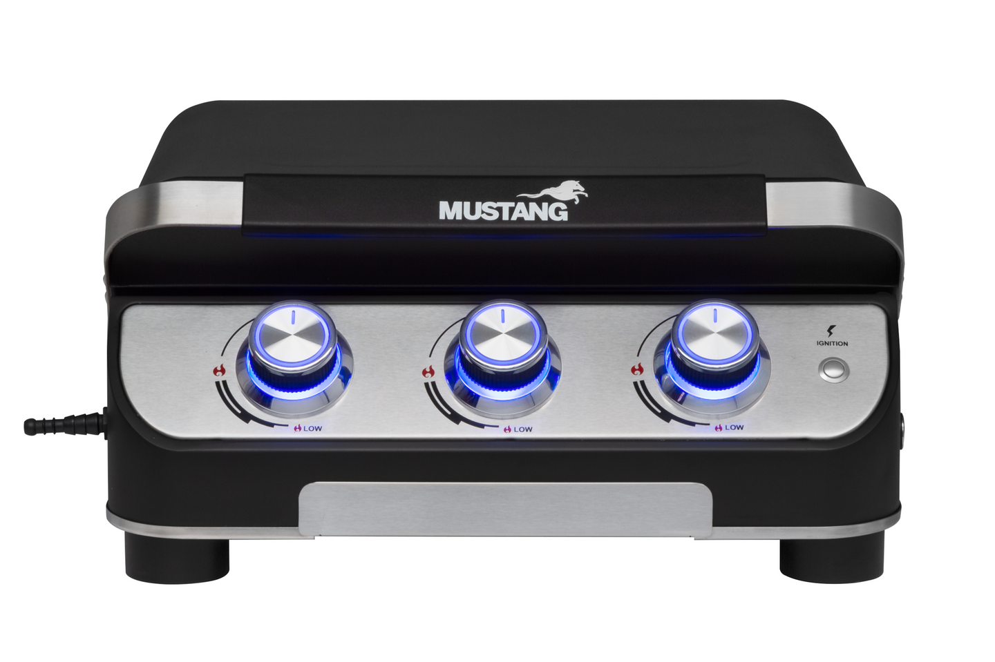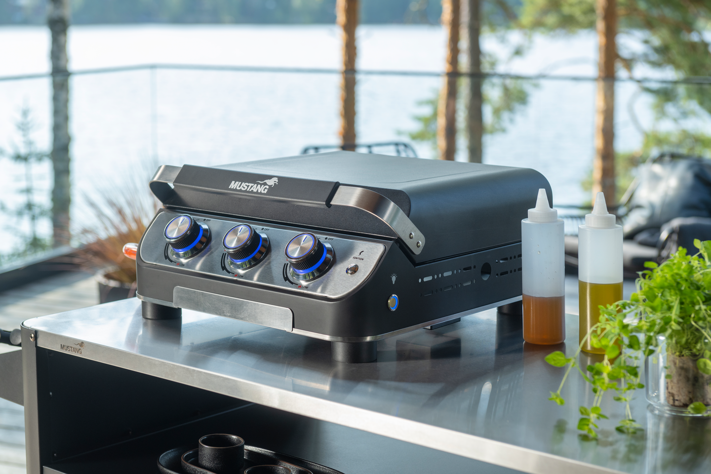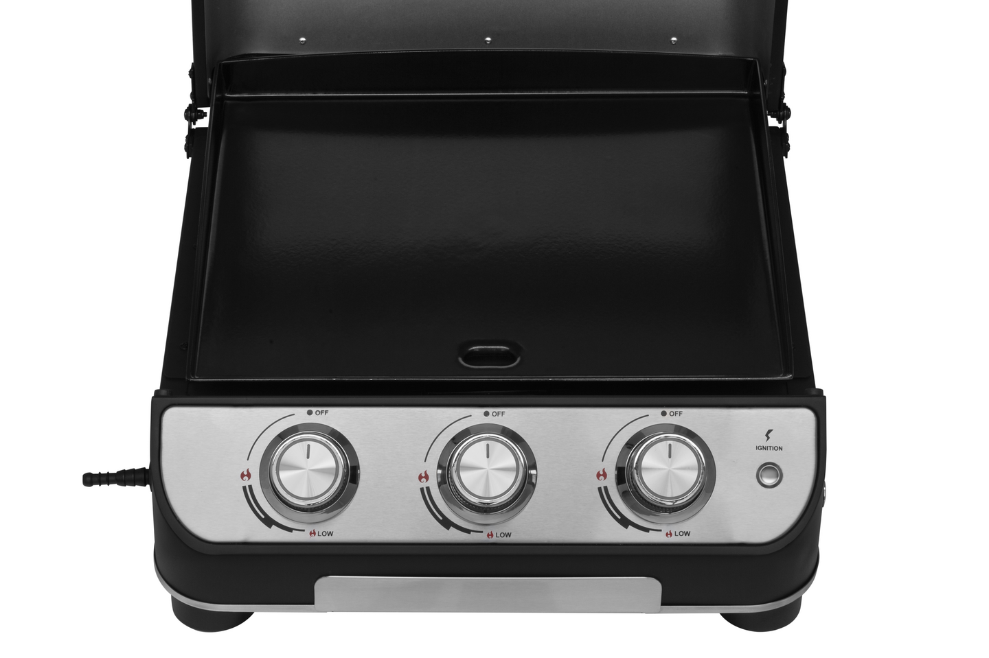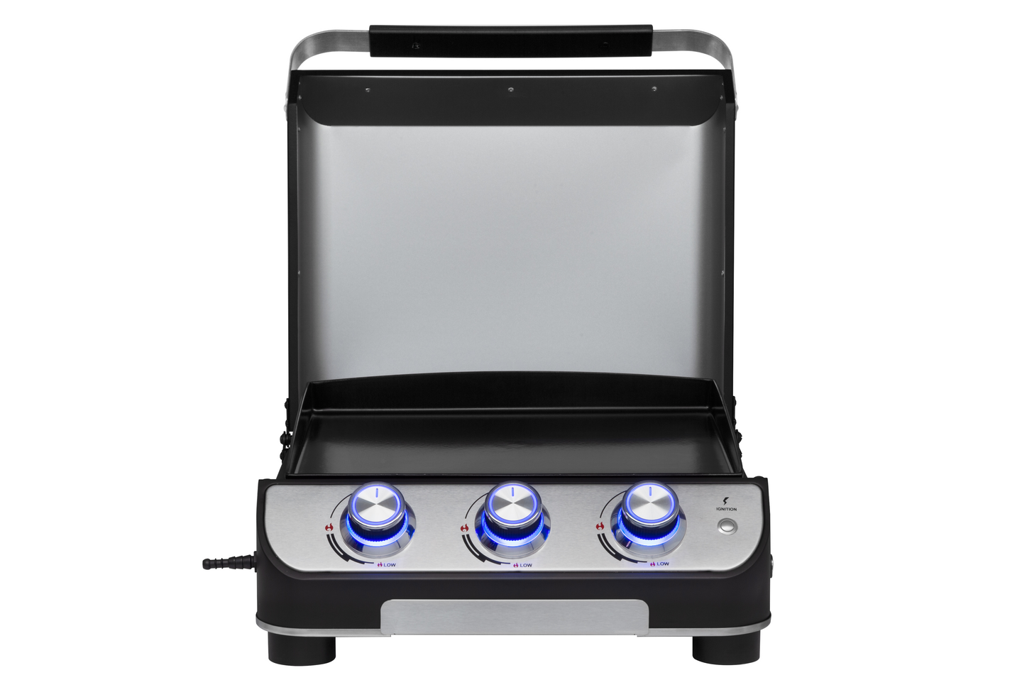 Pöydällä pidettävä plancha-parilagrilli kolmella polttimella.