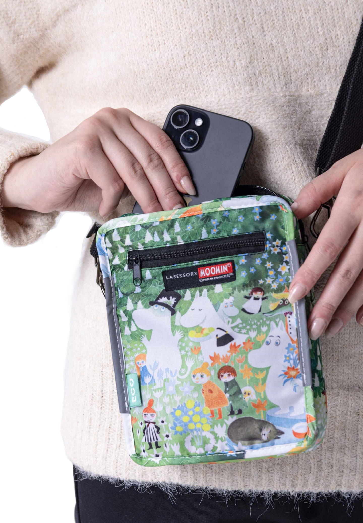 Kätevä monitoimilaukku, vetoketjutasku ja säädettävä hihna, pestävää ja kestävää kierrätyspulloista valmistettua kangasta