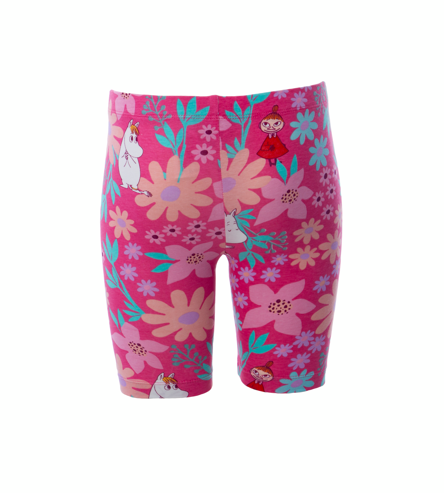 Muumi lasten pyöräilyshortsit, pehmeää puuvillatrikoota, joustava vyötärö, Muumimamma, Niiskuneiti ja Pikku Myy printti.