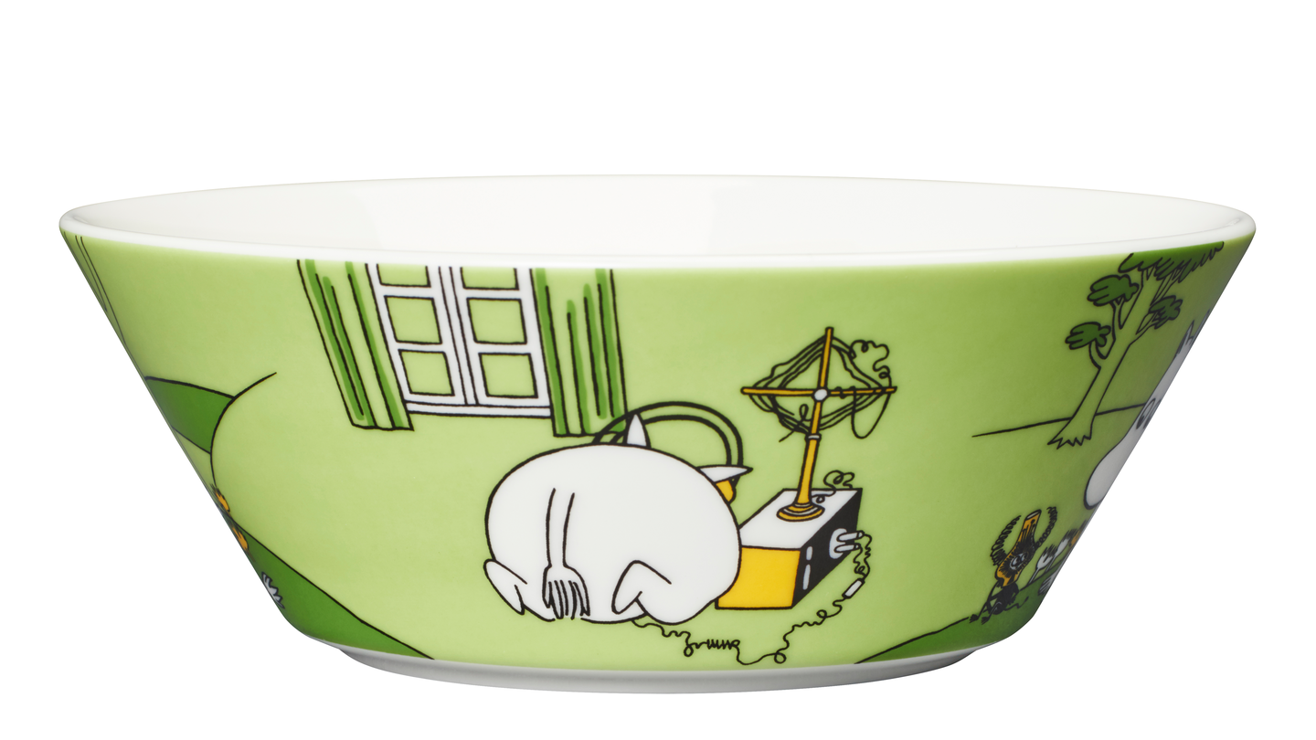 Muumipeikko on hyväntuulinen ja utelias. Hän haluaa tutustua uusiin asioihin ja auttaa aina muita. Maailmassa on paljon jännittävää tutkittavaa, mutta erityisesti Muumipeikko pitää kivien ja näkinkenkien keräämisestä. Hän rakastaa merta kuten koko muumiperhe. Moomin by Arabia, kulho 15 cm, Muumipeikko, nurmenvihreä