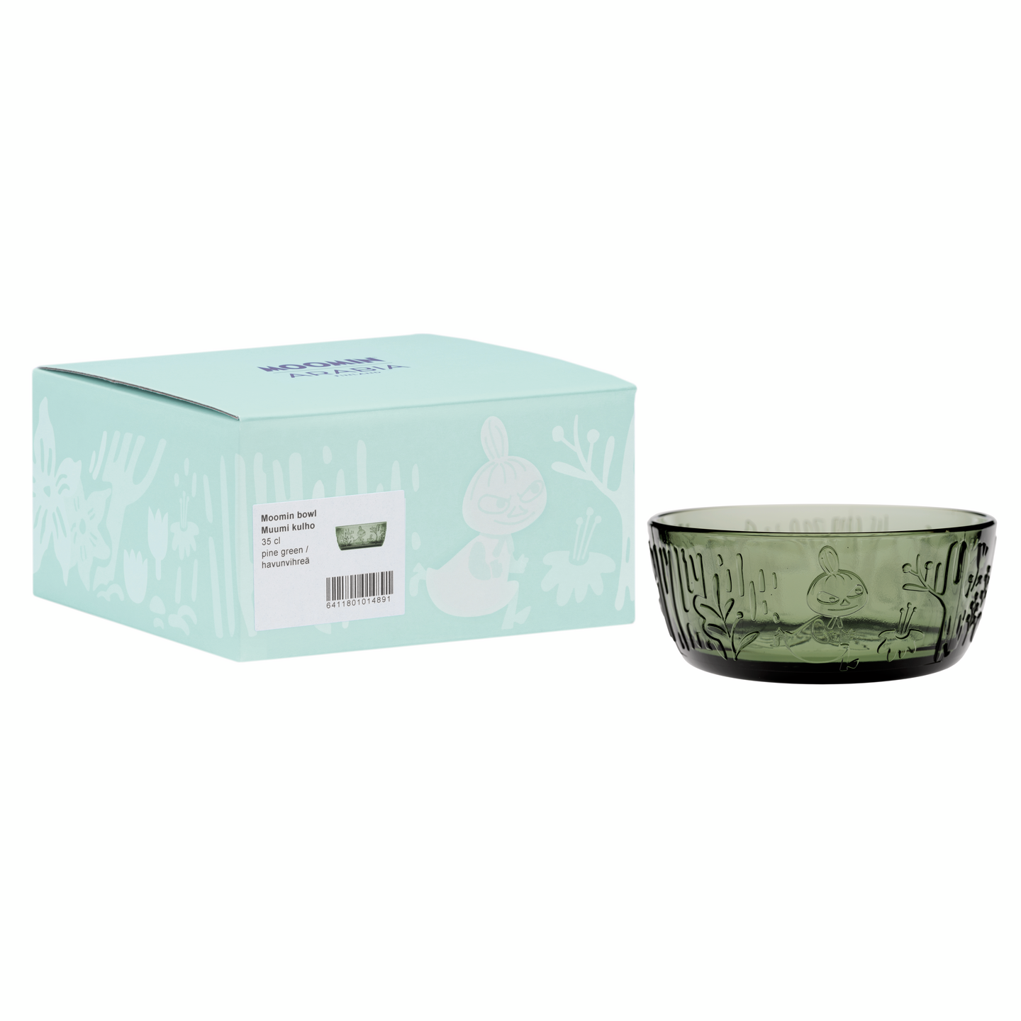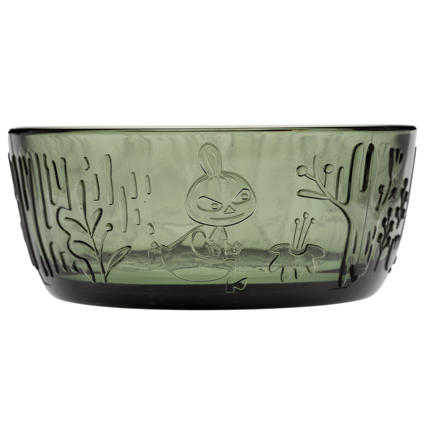 Viehättävä, kohokuvioitu lasikokoelma on saanut inspiraationsa Tove Janssonin teoksesta “Taikurin hattu”. Moomin Arabia, kulho havunvihreä 35 cl