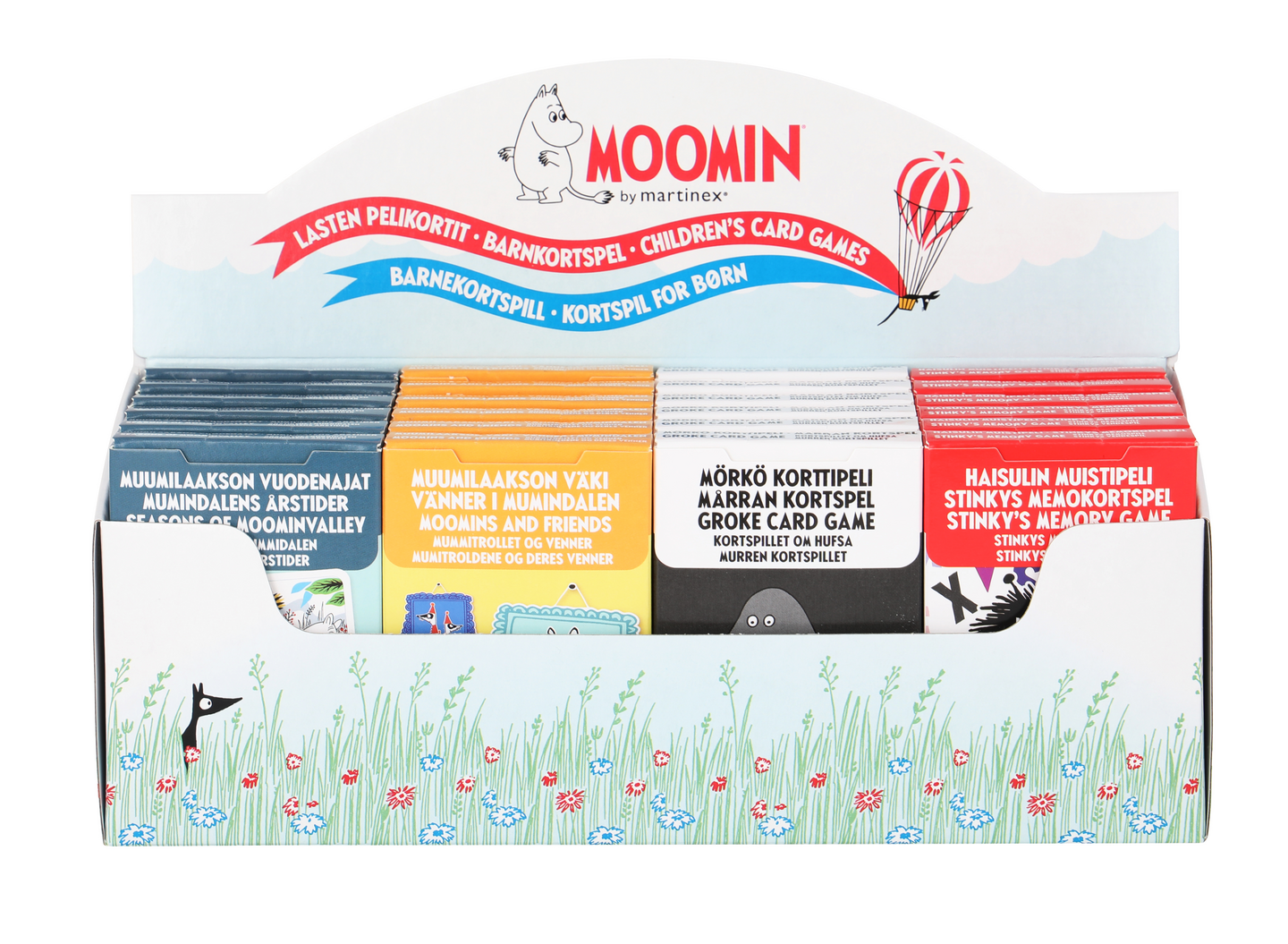 Hauskoja ja yksinkertaisia korttipelejä lapsille. Lajitelmassa korttipelit Mörkö, Muumilaakson vuodenajat, Muumilaakson väki ja Haisulin muistipelikortit.