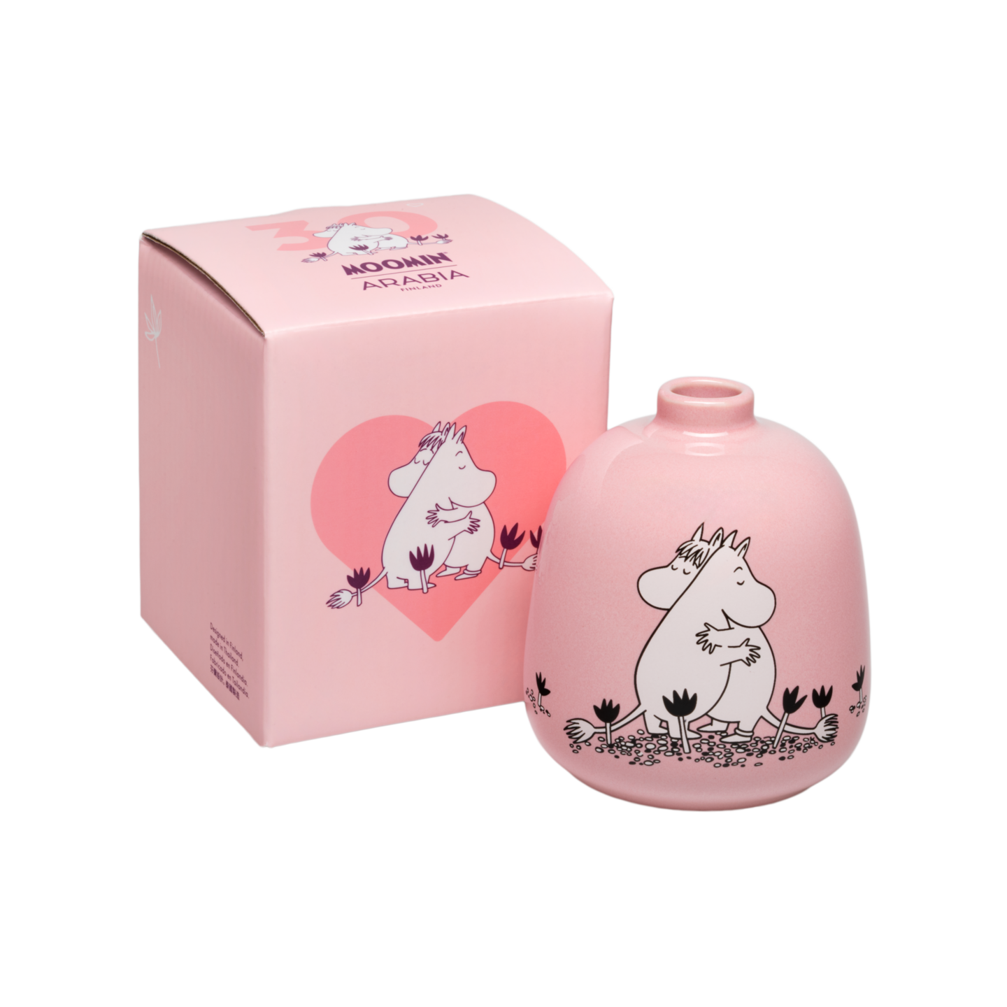 Kaunista Rakkaus-maljakkoa koristaa kuvitus, jossa Niiskuneiti ja Muumipeikko halaavat. He ovat hyviä ystäviä ja leikkikavereita – ja joskus enemmänkin. Moomin Arabia maljakko 83mm, Rakkaus. Puhdistus kostealla liinalla.