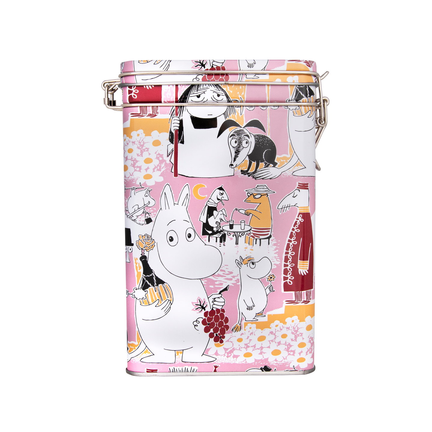 Klassinen kahvipurkki, jonka roosalla pohjalla on Muumi -kuosia. Kuosissa esiintyy Muumimamman kotiapulainen, Miska. Kahvipurkissa on tiivis saranakansi ja solkilukko. Käsinpesu ja huolellinen kuivaus.