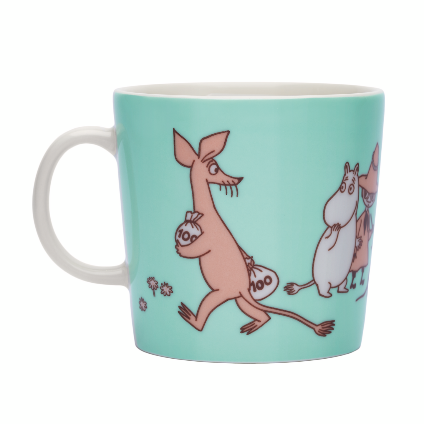 P-mukissa Muumit ovat lähettäneet Mimmi-tädille vitsinä laatikollisen rumia sanoja, mutta tätiä pila ei naurata. Hän päättää antaa Muumien kuulla kunniansa ja lahjoo Nipsun kertomaan heidän olinpaikkansa. Kuvitukset pohjautuvat sarjakuvaan ”Muumiperhe”. Moomin Arabia muki 0.4 l, ABC P