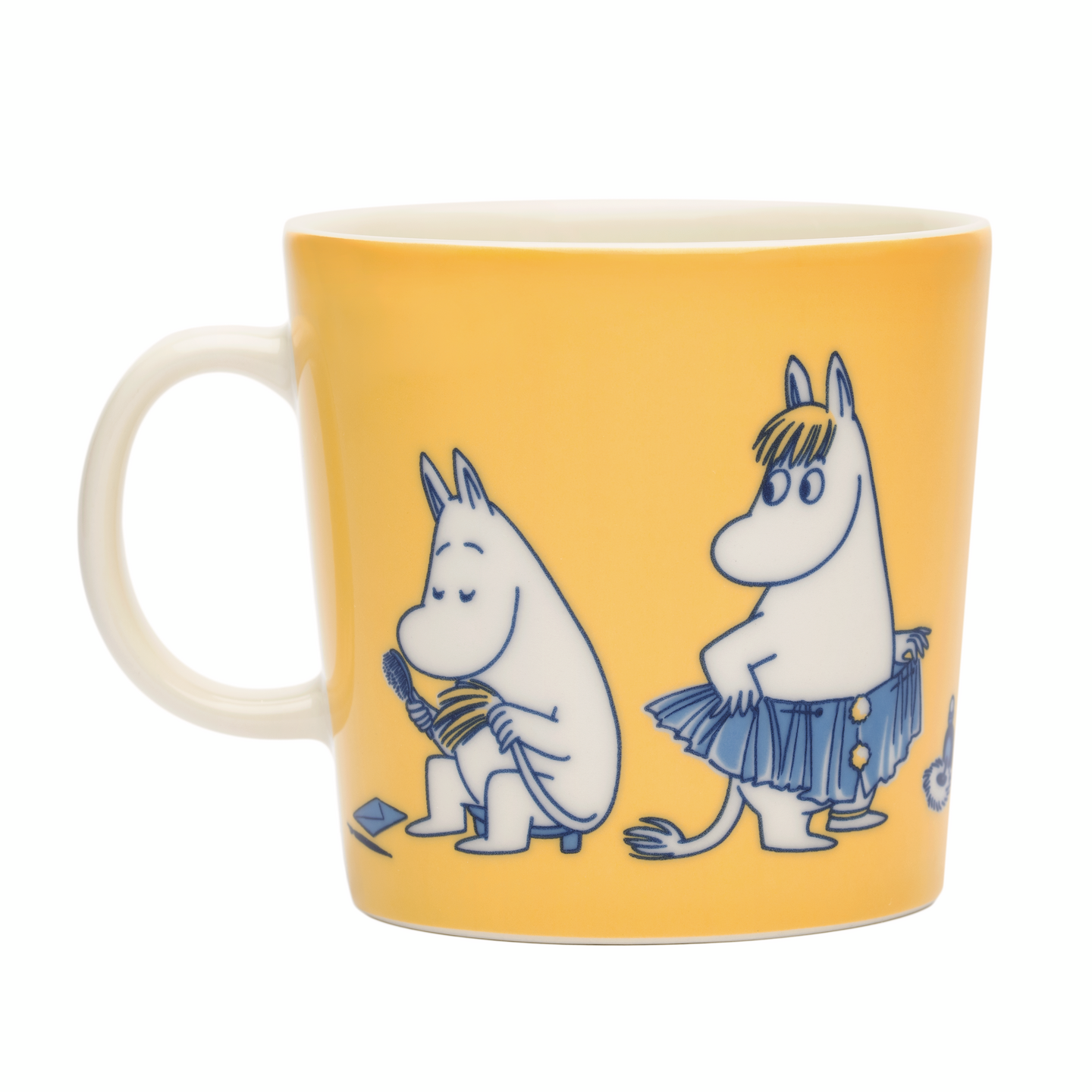 T-mukissa Muumipappa nauttii hienostopiirin cocktailkutsujen tarjonnasta. Muumipeikko on onnistunut kasvattamaan kaljuuntuvan häntänsä päähän kultaisen tupsun, minkä vuoksi Muumit ovat ylipäänsä saaneet kutsun mukaan juhliin. Kuvitukset pohjautuvat sarjakuvaan ”Muumipeikko ja kultainen häntä”. Moomin Arabia muki 0.4 l, ABC T