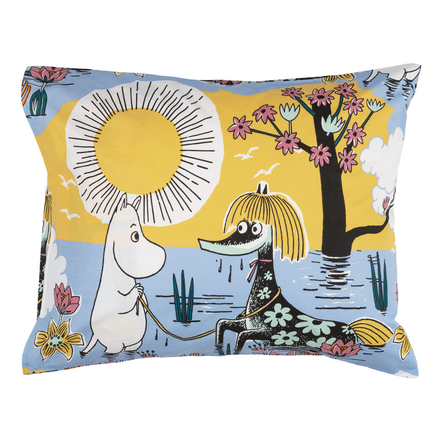Luettuaan romanttisia kertomuksia Muumipeikko haluaa pelastaa neidon pulasta aivan kuten romaaneissa. Sen sijaan hän kohtaakin Primadonnan hevosen, kun auringon säteet viimein tavoittavat Muumilaakson pitkien sateiden jälkeen. Taianomaisia unia! Moomin Arabia tyynyliina 50x60 cm Primadonna.