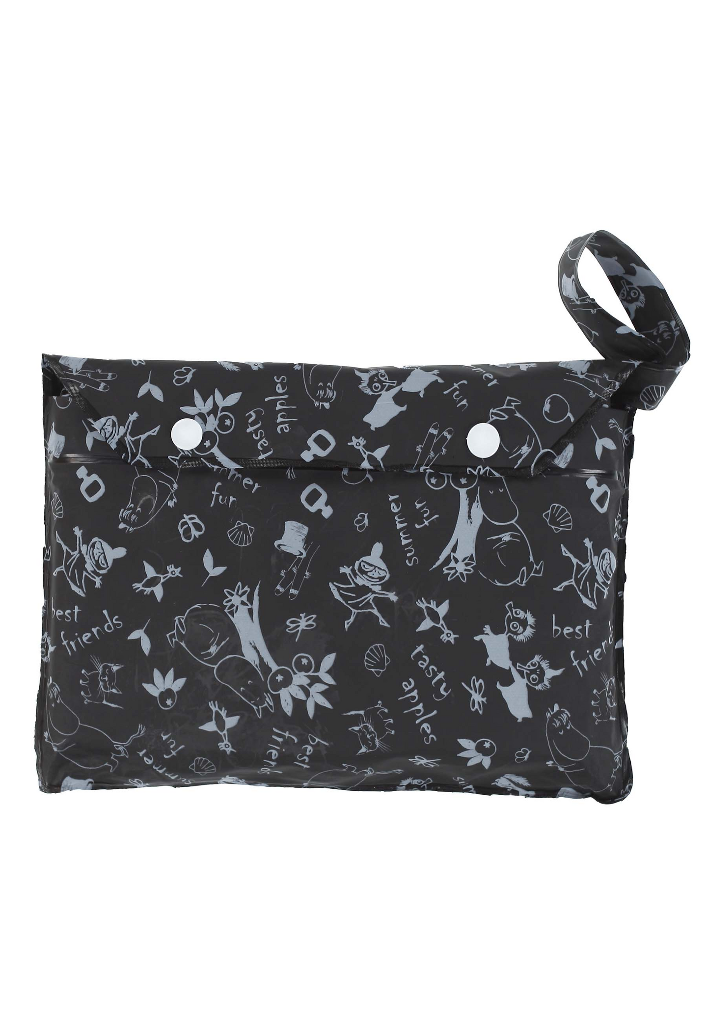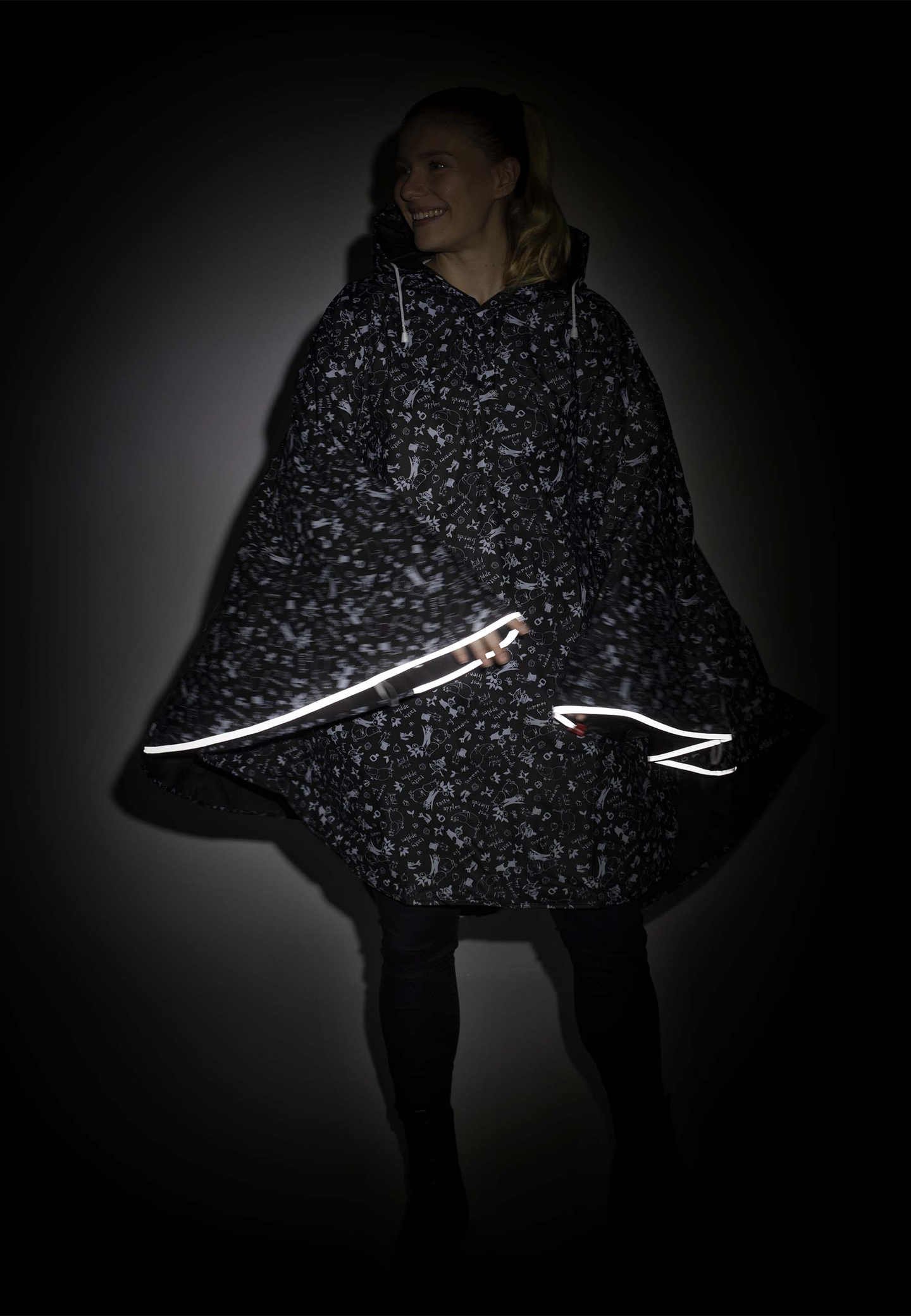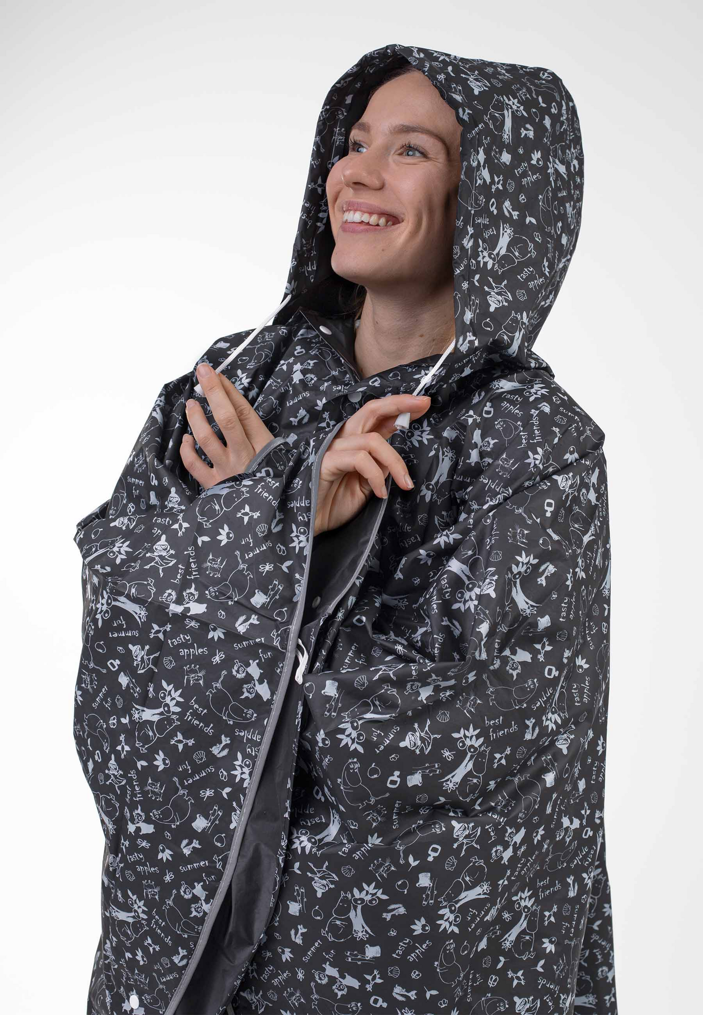 Mustapohjainen sadeponcho valkoisella Muumi-painatuksella. Pääntiellä painonapit, hupun reunassa kiristynyöri. Heijastavat yksityiskohdat lisäävät turvallisuutta. Yksi koko aikuisille, viitan pituus olalta 105 cm.