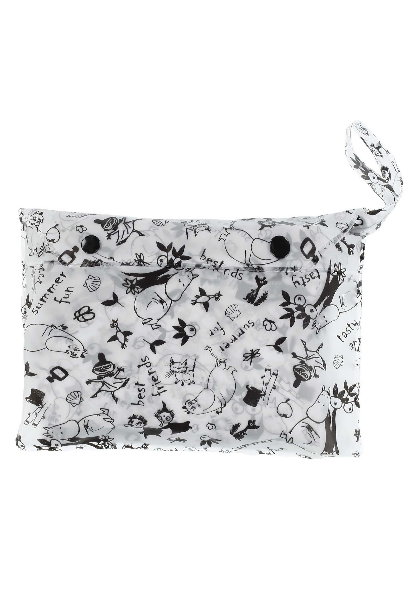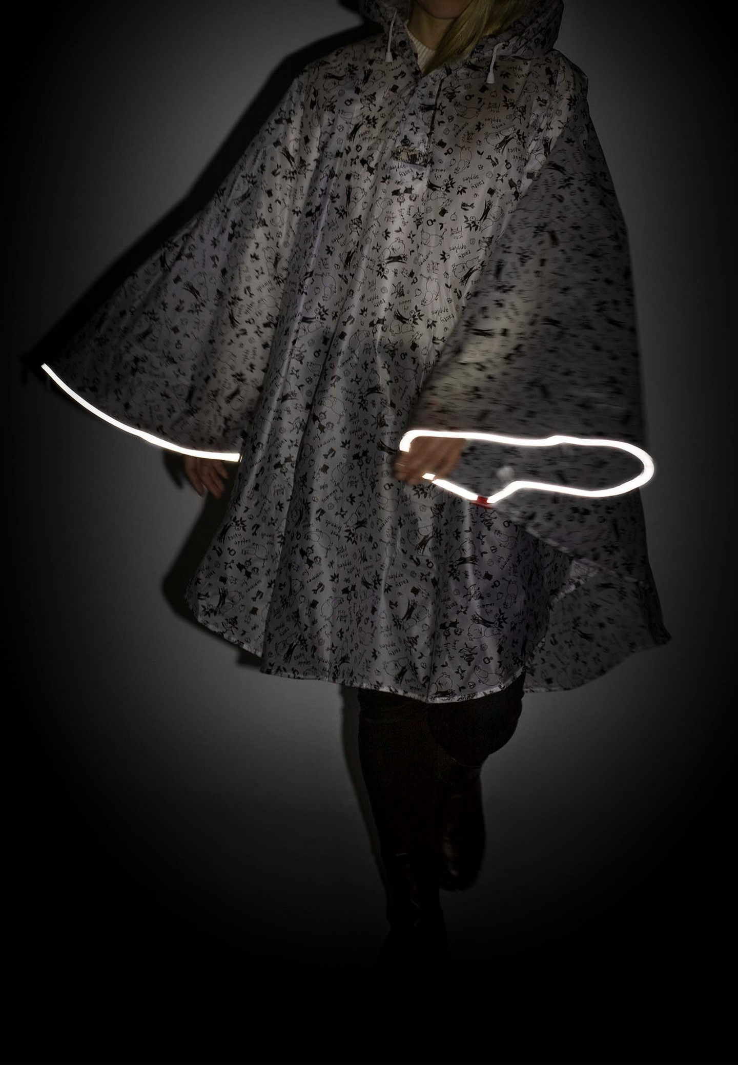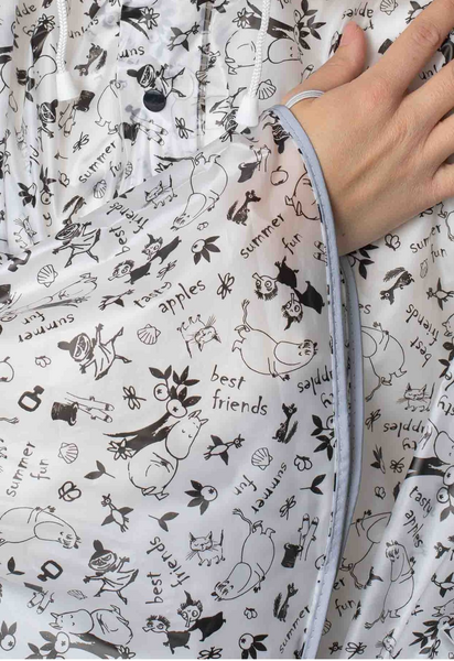 Valkopohjainen läpikuultava sadeponcho Muumi-painatuksella. Pääntiellä painonapit, hupun reunassa kiristynyöri. Heijastavat yksityiskohdat lisäävät turvallisuutta. Yksi koko lapsille, viitan pituus olalta 65 cm.