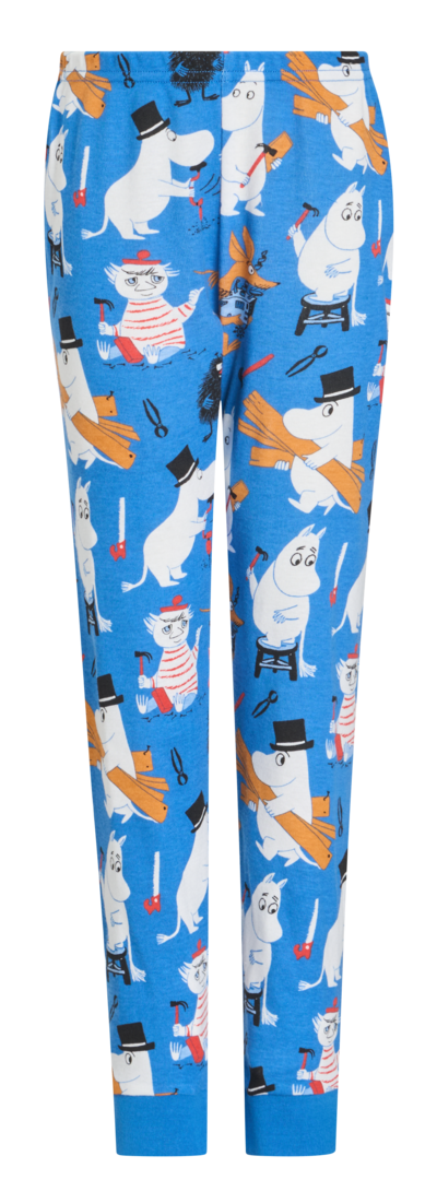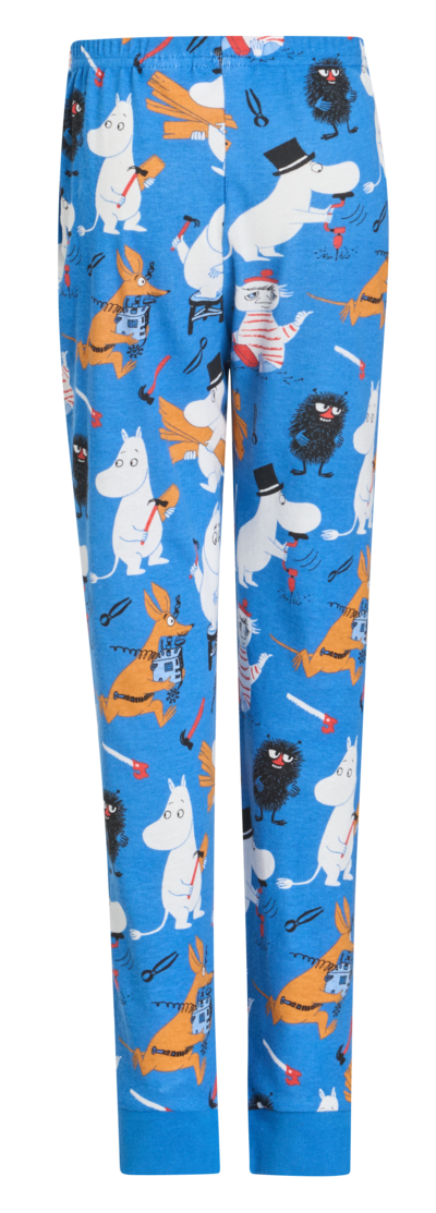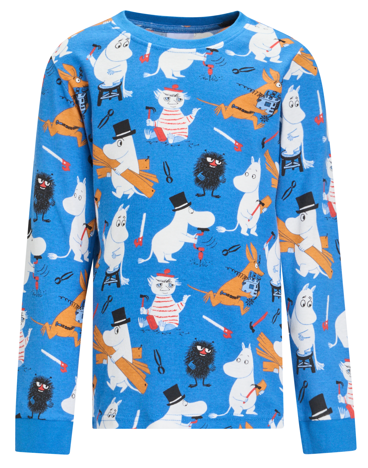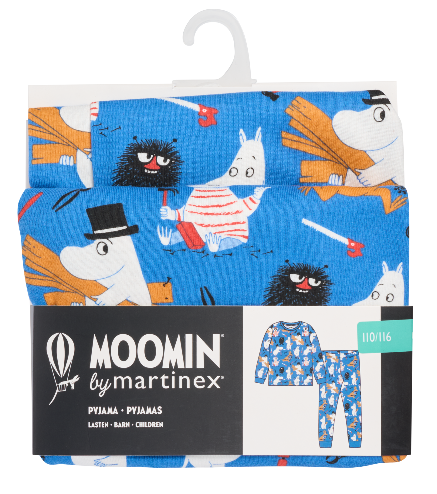 Mukavan pehmeästä puuvillasta valmistettu lasten muumiaiheinen pyjama. Paidassa on pitkät hihat ja pyöreä pääntie. Housuissa on pitkät lahkeet ja joustava kuminauhavyötärö.