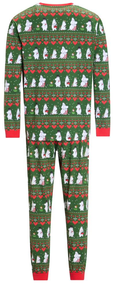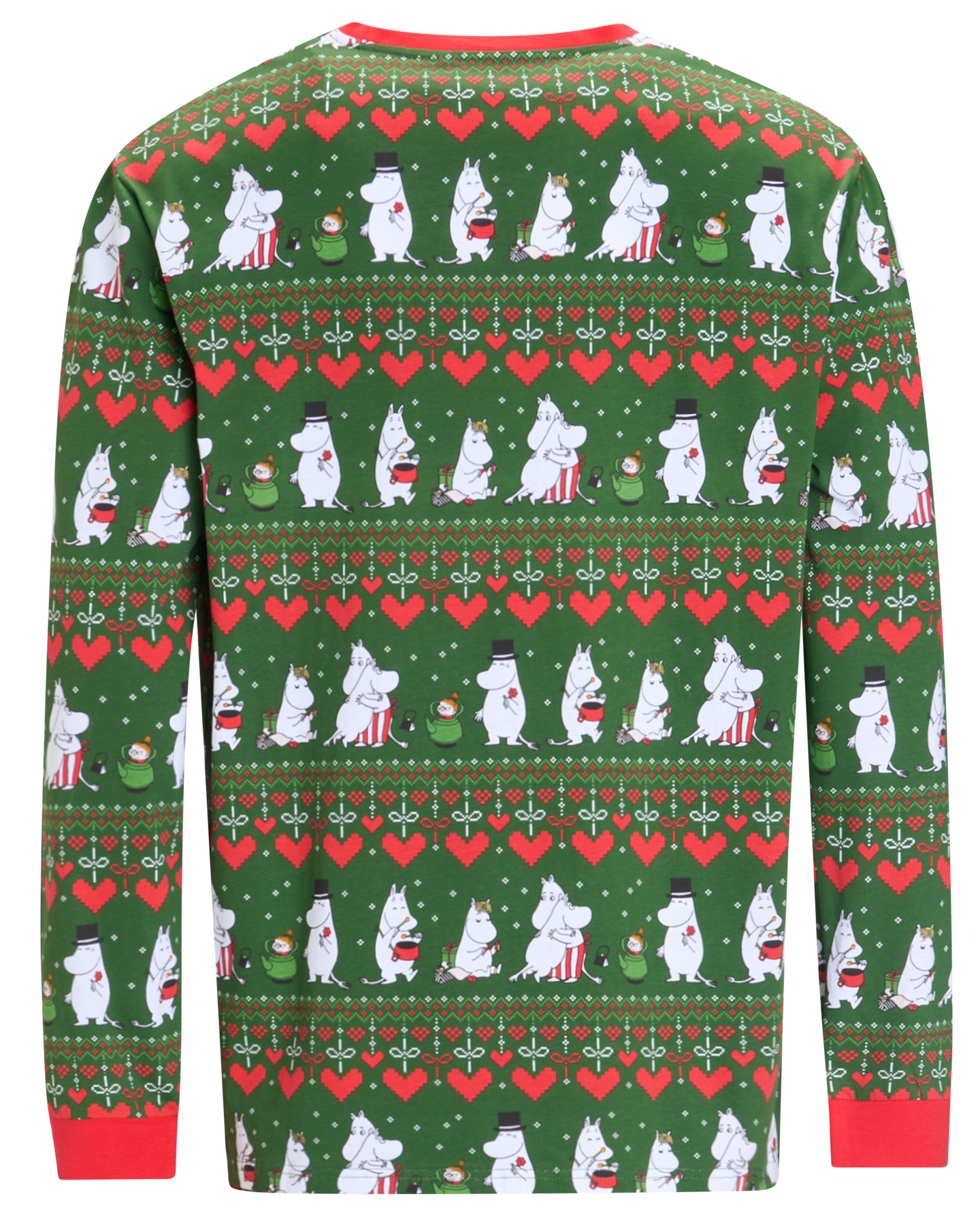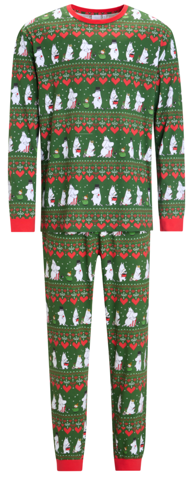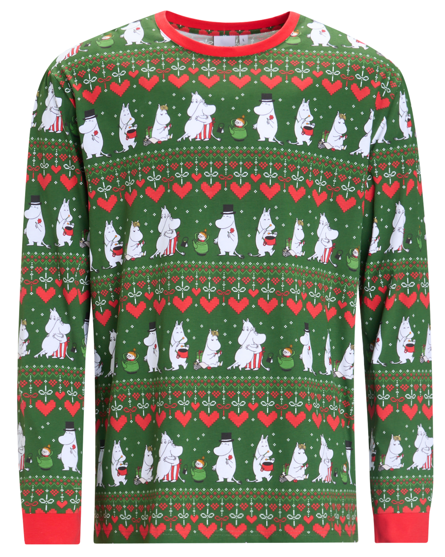 Mukavan pehmeästä kankaasta valmistettu miesten muumiaiheinen joulupyjama. Paidassa on pitkät hihat ja pyöreä pääntie. Pitkälahkeisissa housuissa on joustava kuminauhavyötärö ja resorit lahkeensuissa. Valmistettu puuvillasta.