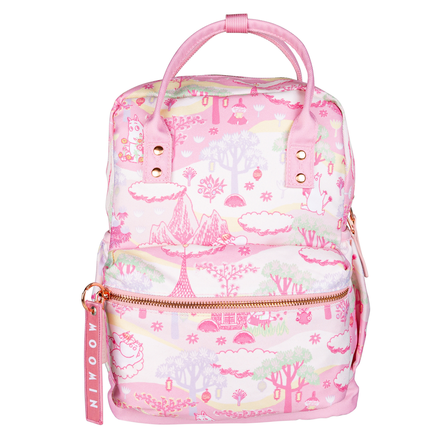 Näppärän kokoinen muumiaiheinen pikkureppu. Polyesteristä valmistetussa repussa on pehmustetut ja säädettävät olkahihnat, tilava etutasku, avo sisätasku ja kaksi sivutaskua, joihin mahtuu esim. juomapullo. Kantokahvat saa kiinnitettyä toisiinsa nepparikiinnikkeellä. Repun tilavuus on noin 10 litraa.