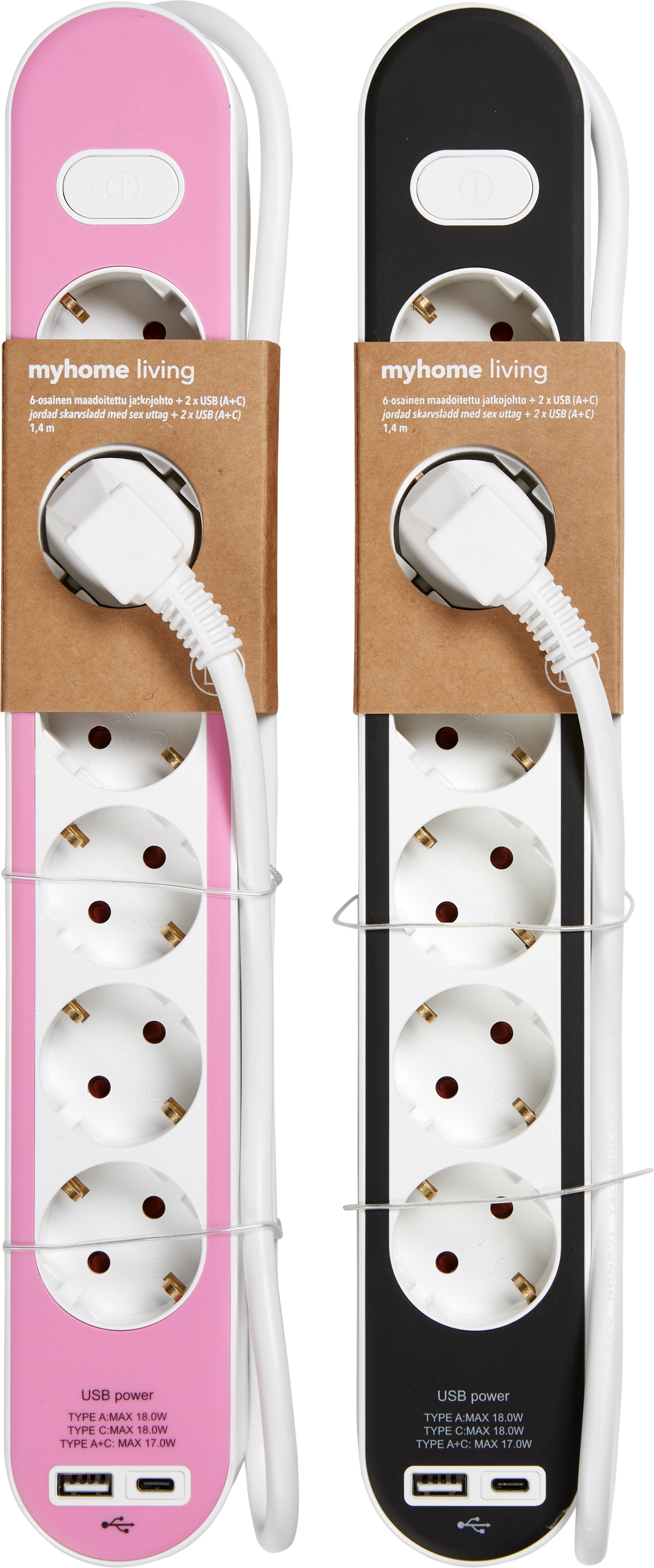 Tyylikkäässä jatkojohdossa on 6-pistokepaikkaa ja kaksi USB -paikkaa, toinen on USB-A ja toinen USB-C.