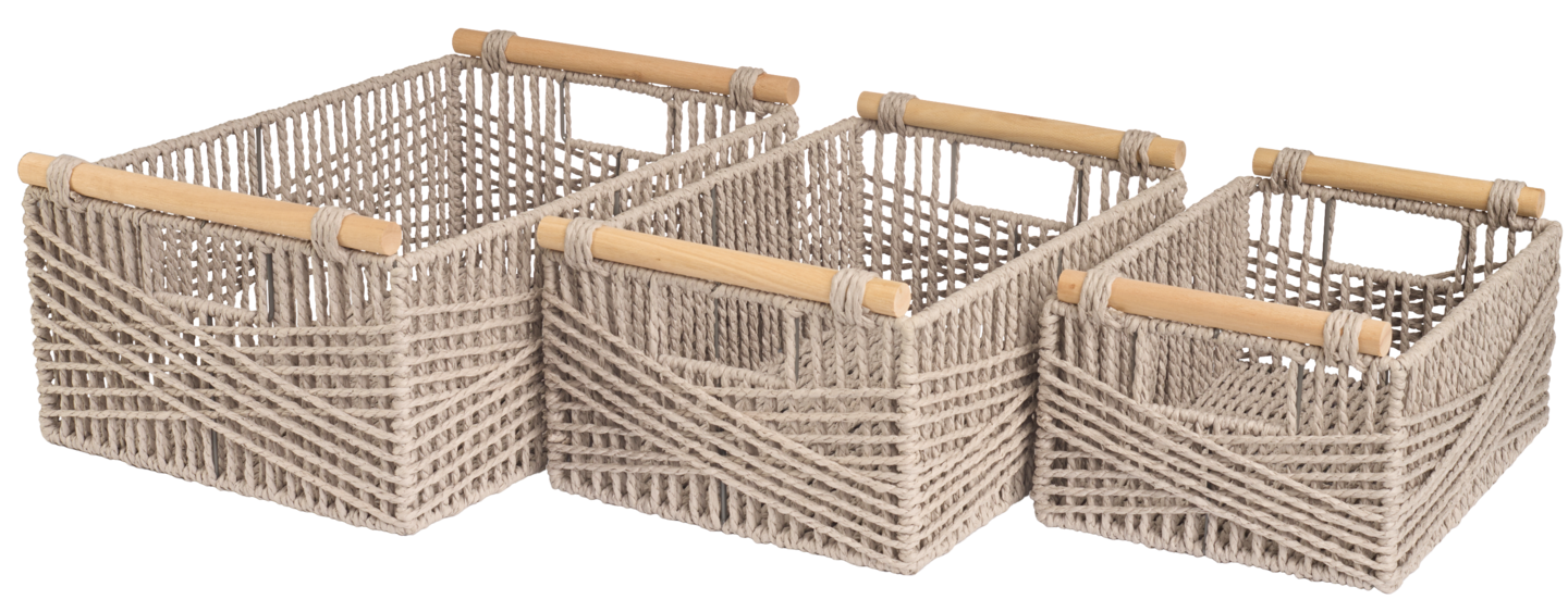 Harmaa, suorakulmainen paperinarukori puisilla kantokahvoilla. Paperinaru on solmittu metallikehykseen, joka pitää korin tukevasti muodossa. Koria on kolme eri kokoa. Keskikokoisen korin leveys on 33 cm, pituus 23 cm ja korkeus 14 cm.