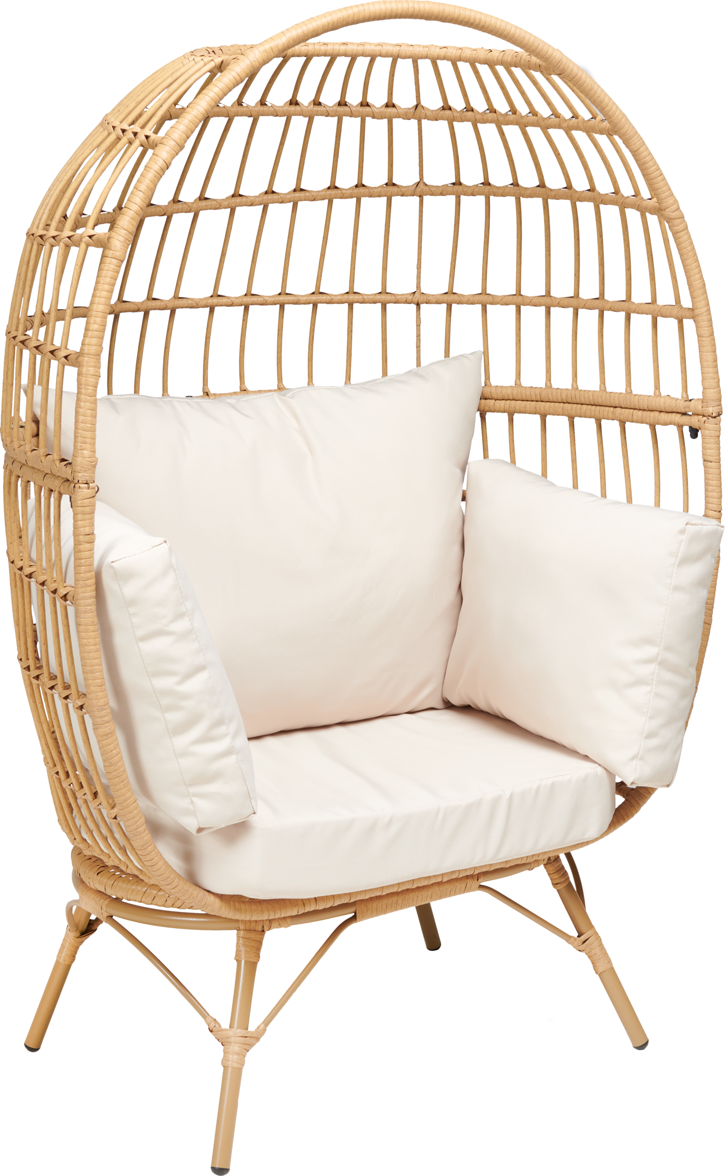 Kaunis ja mukava luonnollisen värinen punottu polyrottinkinen korituoli teräsrungolla ja vaaleilla pehmusteilla.